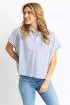 A breezy V-neck poplin blouse cut in crisp striped cotton for an effortless, polished look. The V-Neck Poplin Blouse from Karlie features a relaxed boxy silhouette and short dolman sleeves that tuck easily into high-waist denim or tailored trousers. Lightweight and work-friendly, it transitions from office to weekend with casual polish.