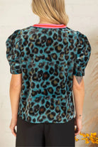 Bold yet playful, this statement blouse combines a vibrant velvet teal leopard print with a striking contrast neckline trim in hot pink and coral. Featuring a relaxed silhouette with short puff sleeves and a split V-neck, this top is designed to elevate both casual and dressy looks.
