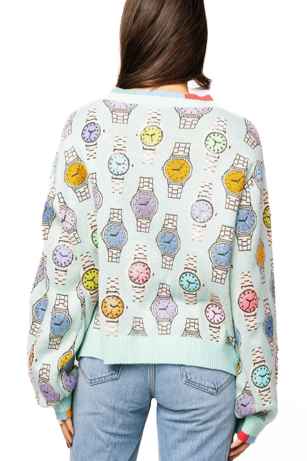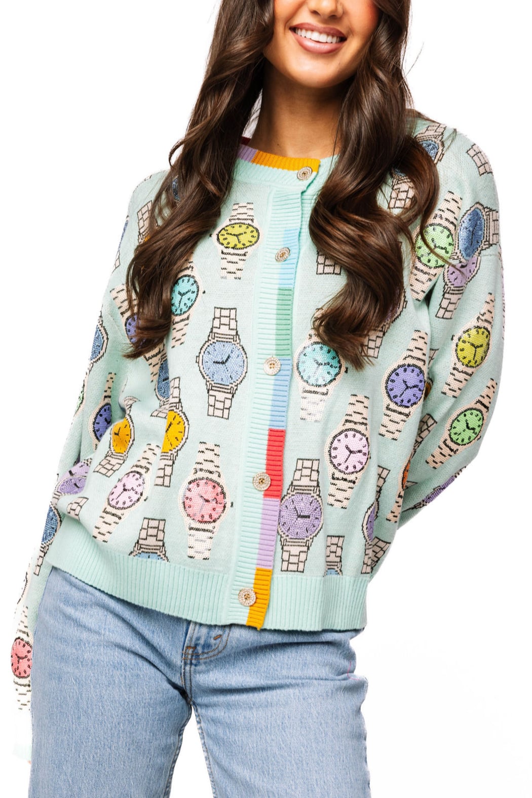 A playful button-up cardigan patterned with colorful watch motifs in pastel hues. The Watch Button Up Cardigan has a relaxed, slightly boxy silhouette and ribbed hem and cuffs for a cozy fit. Queen Of Sparkles designed this sweater with long sleeves and a crew-style neckline that layers easily over tees or shirts. It's a casual piece made for laid-back days or cozying up at home.