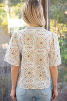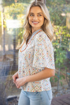 This short sleeve top features a vibrant geometric floral print with a contrast striped V-neckline and orange trim. Lightweight and easy to wear, it pairs effortlessly with denim for a fresh everyday look