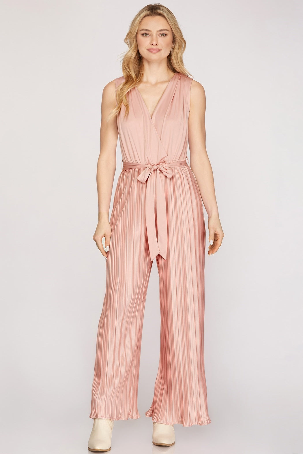 Sleeveless surplice jumpsuit with pleated pants with a waist tie is the perfect summer jumpsuit. The model is 5'8" for length reference. It is a nice soft fabric that won't get hot to wear in the summer. It does have a hook and eye fixture across the chest.