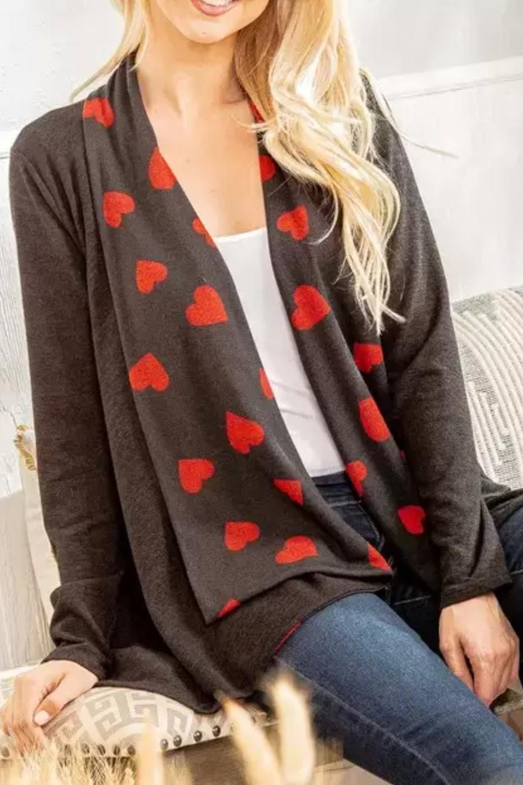 LONG SLEEVE SOLID AND HEART PRINT CONTRAST OPEN CARDIGAN WITH DRAPED AND SIDE POCKET DETAIL
