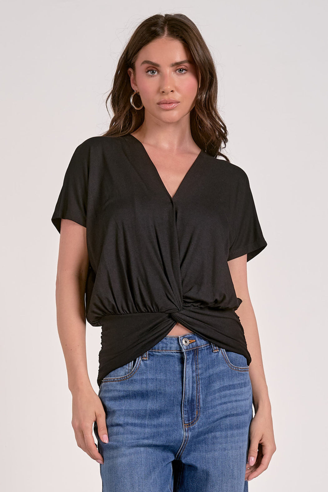 Meet your new everyday favorite—the Twist Front V-Neck Tee. This effortlessly chic staple features a flattering twist-front detail that adds just the right amount of style to your classic tee look. Crafted from luxuriously soft, breathable fabric, it offers a relaxed fit that drapes beautifully and moves with you from day to night. Easy to dress up or down, it’s the kind of piece you’ll reach for again and again.