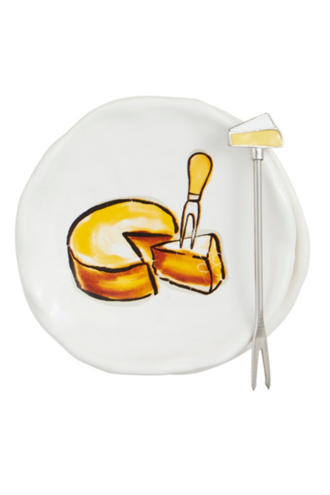 Cheese Tapas Plate Set. This elegant 3-piece set is perfect for serving a variety of tapas and small bites. It includes two beautifully crafted stoneware tidbit dishes, each with a 4-inch diameter, providing ample space for your favorite cheeses, olives, or other appetizers. Accompanying the dishes is a stylish metal tapas fork, measuring 4 inches in length, featuring an enamel figural topper that adds a touch of charm and sophistication to your dining experience. The stoneware material ensures durability and a classic look, making this set a delightful addition to any gathering or dinner party.