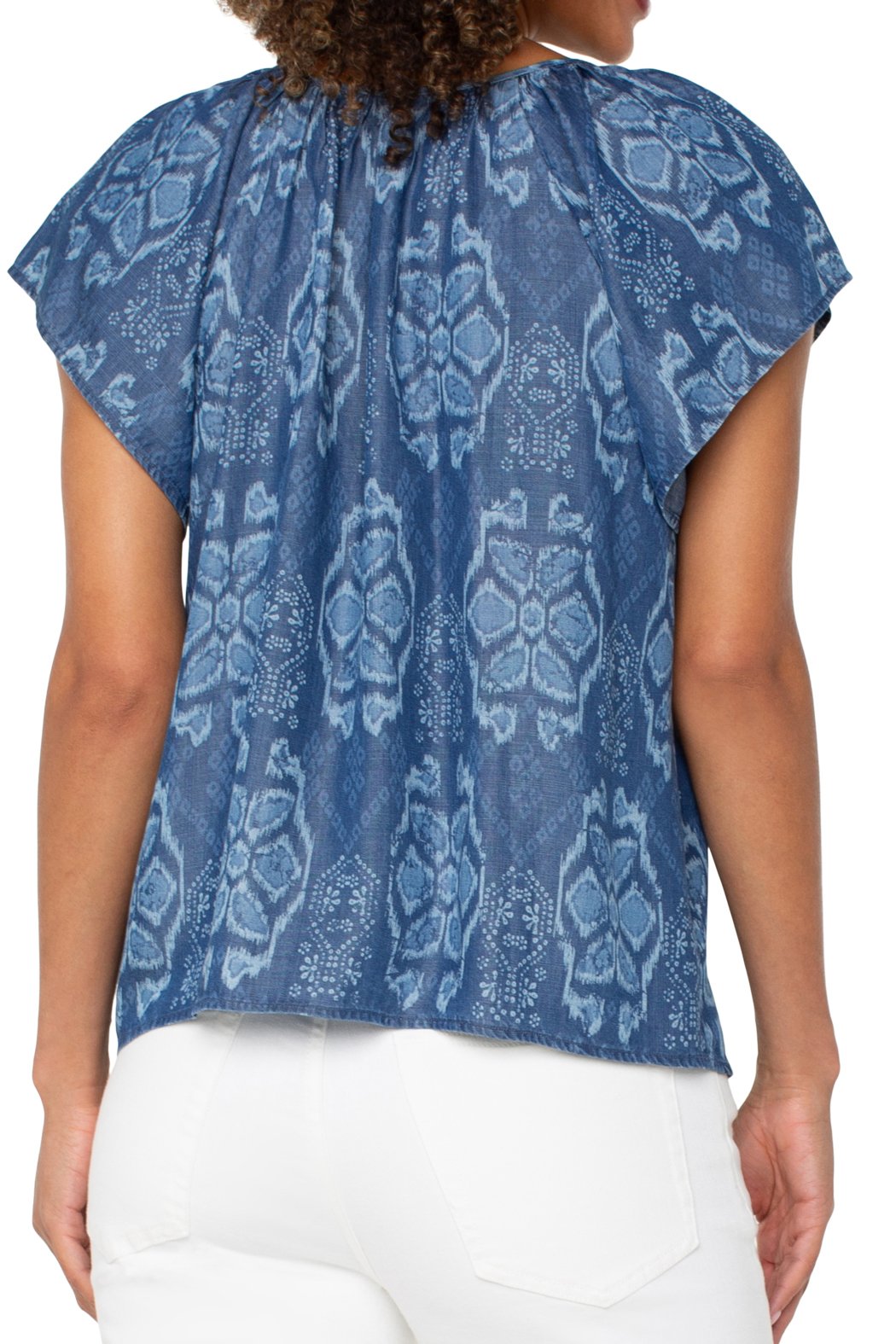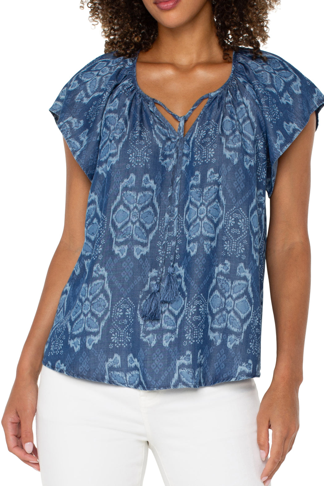 Say hello to your new go-to top for summer days and breezy nights. This lightweight beauty features a soft ikat-inspired print in rich indigo hues, flutter sleeves, and a relaxed silhouette. The split neckline is finished with tassel ties for an extra touch of charm. Pair it with white denim or a flowy skirt—she’s easy, effortless, and full of personality.
