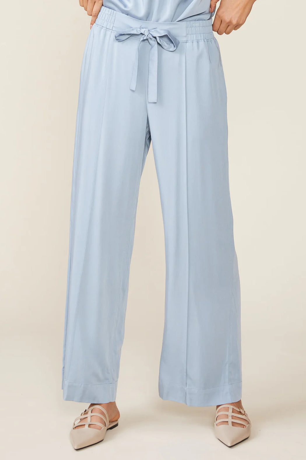 Relaxed pintuck pull on pants with pockets crafted in a woven Tencel satin. A tie front and elastic back gives an air of both polish and ease. These pull ons are day to night, casual to dressy staples. Pair with the High Fidelity Shell for a stunning head to toe look.