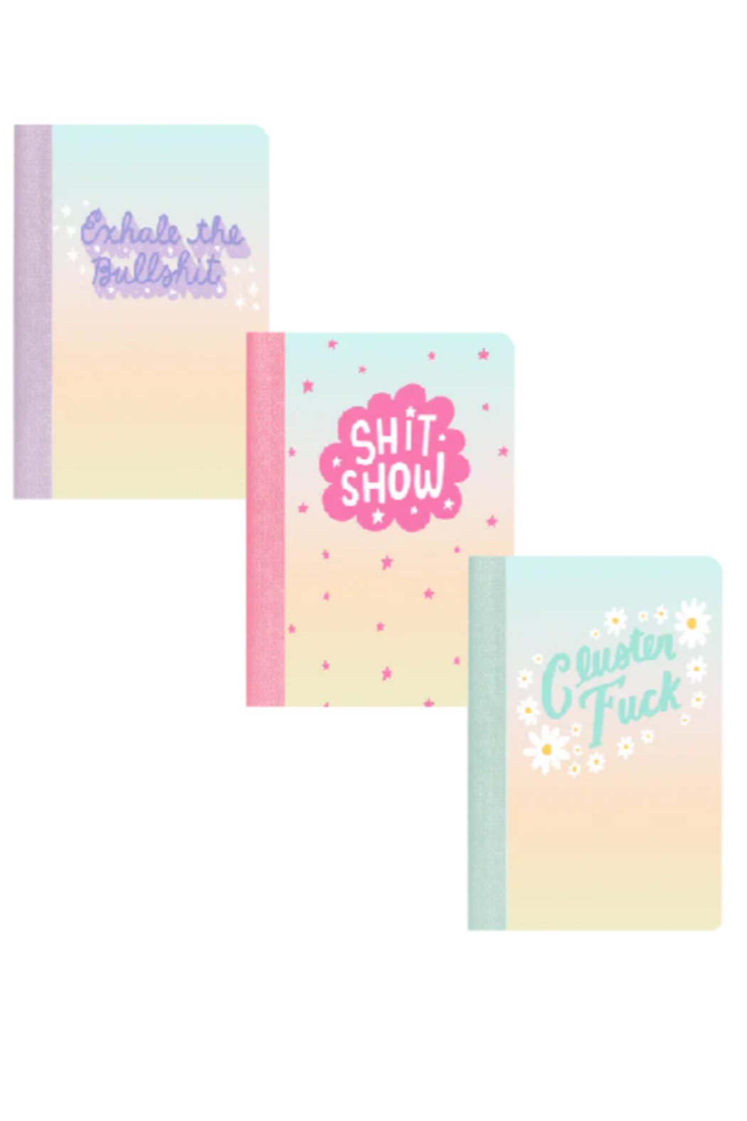 One little, two little, three little notebooks! All designed and packaged as the cutest little set you ever did see. With bright coordinating covers and a mix of page styles, there is nothing this set cannot help you accomplish. Made with "on-the-go" in mind, these cuties are small enough to fit into a pocket, pencil pouch, or tuck into a laptop sleeve and are perfect for any kind of quick note-taking that comes your way. 3.5" W x 5" H x 0.625" D 48 Pages / Tape Bound Exhale The BS - Ombre Pages | Shit Show - Ombre Pages | Cluster Fuck - Ombre Pages Made in USA