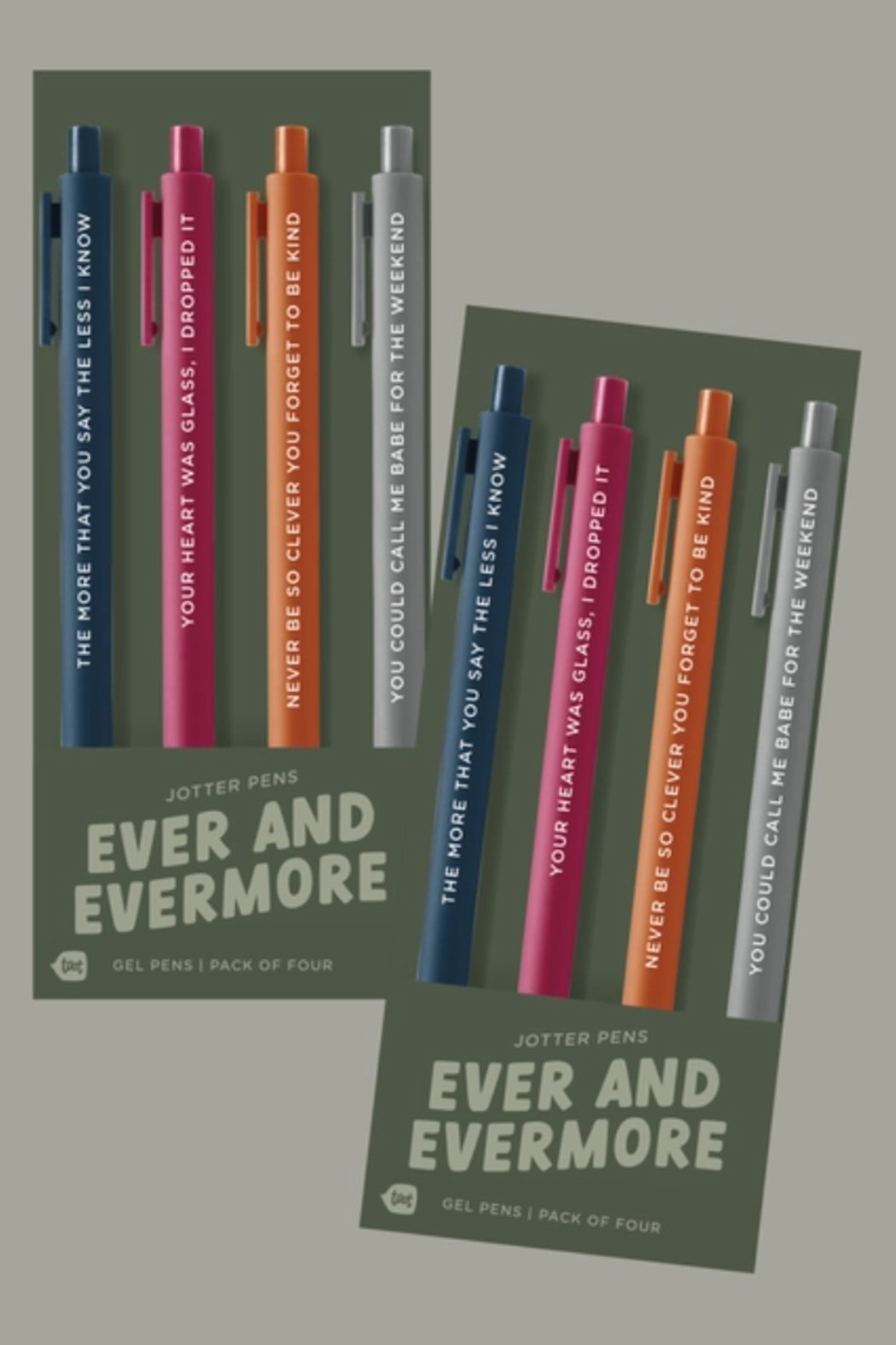 We're enchanted to introduce you to the newest Jotter Packs (Taylor's Version)! Our best-selling soft-touch barrel surface and fine-point gel tip now have a Swiftie flare. Most write in colored gel ink that matches the barrel, with the exception of: White, Gray, Silver, Gold, Rose Gold, Navy-- those write in Black.