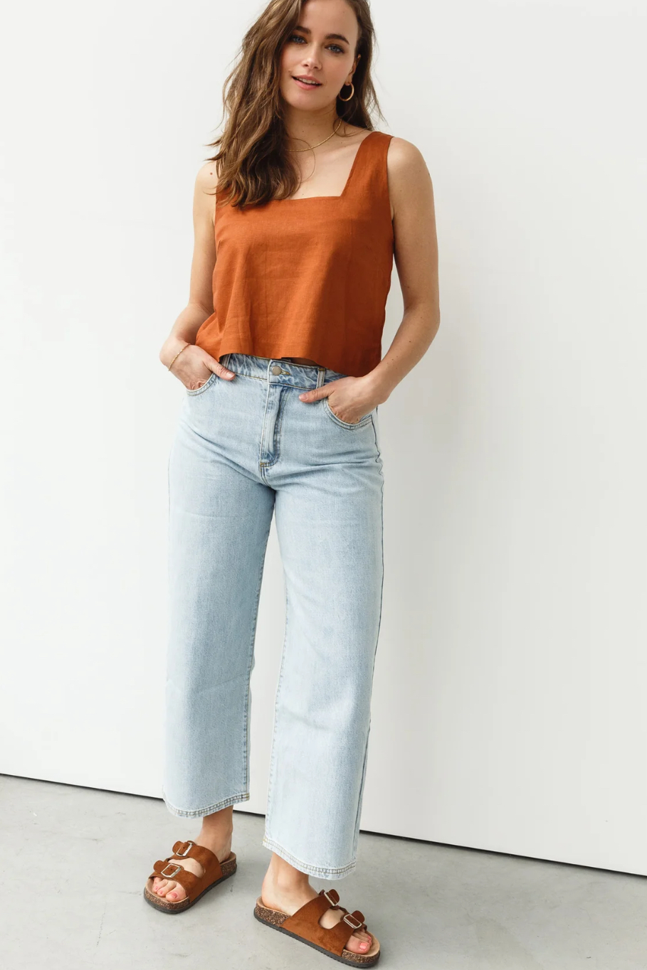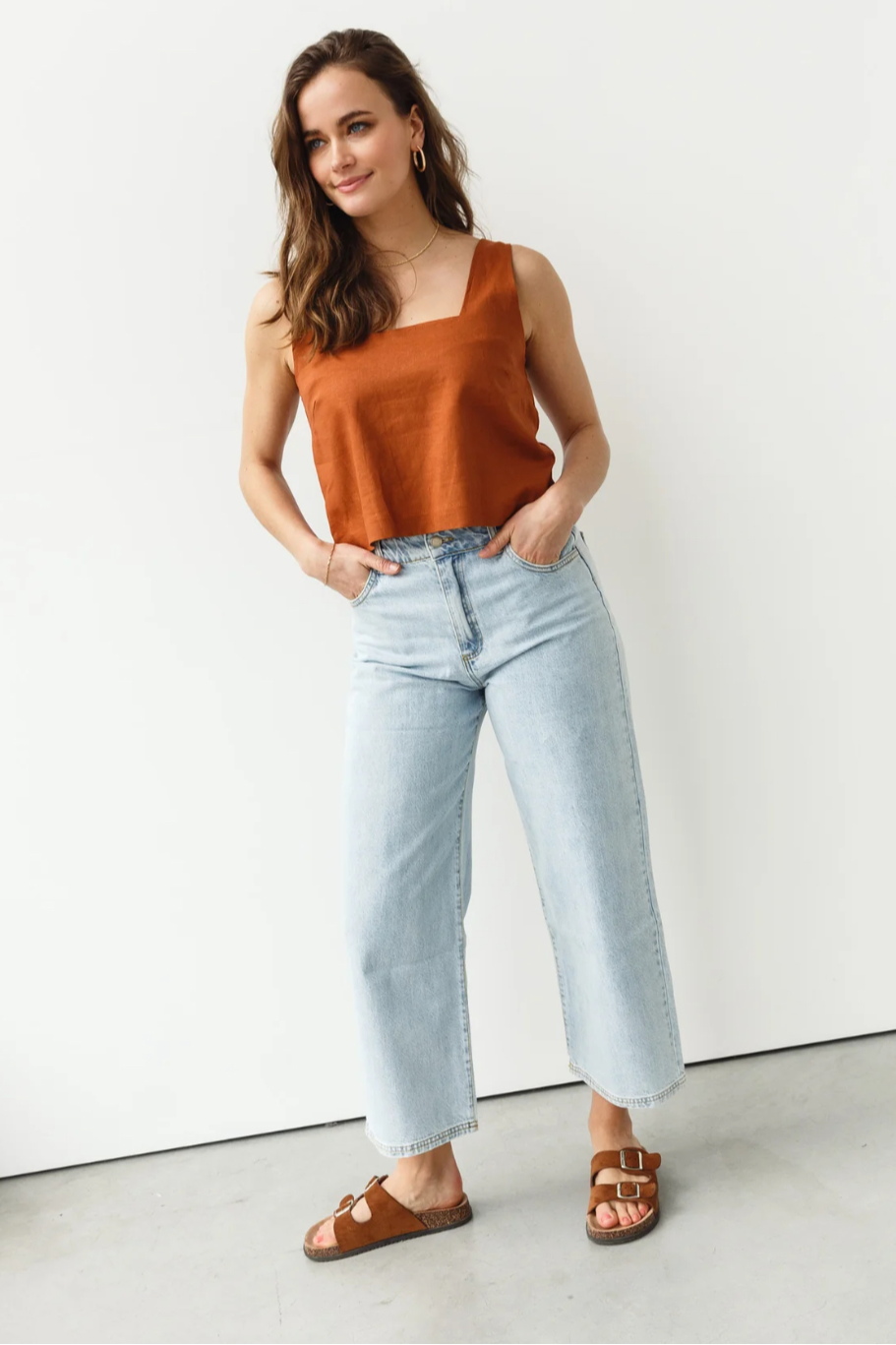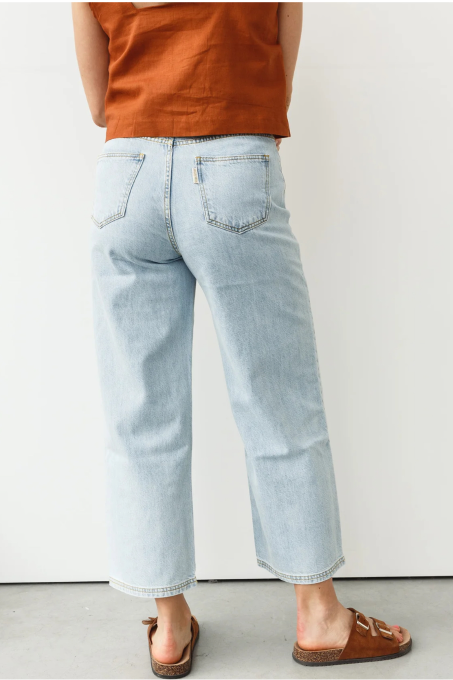 Soft Light Summer Wash Wide Leg Cropped length Premium Denim Jeans. Model is wearing a size small