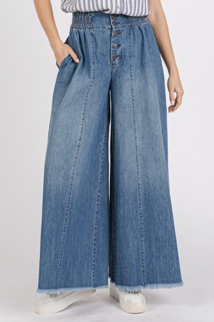 These pants feature: - LIGHTWEIGHT DENIM FABRIC - MEDIUM WASH - ELASTIC WAISTBAND - FRONT BUTTON FLY - HIGH WAISTED - PINTUCK AND SEAM DETAIL - SIDE POCKETS - BACK PATCH POCKETS - FRAYED RAW CUT HEM - WIDE LEG - RELAXED FIT
