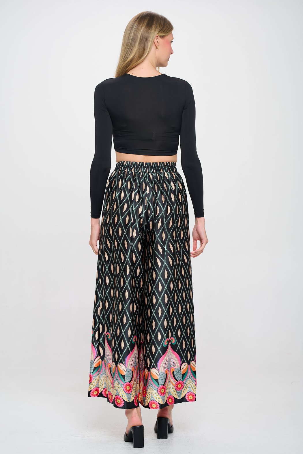 Stand out in style with the Meet Me in Santorini wide-leg printed pants. Featuring a bold geometric pattern combined with vibrant floral accents at the hem, these pants are perfect for making a statement. The high-waisted design and relaxed fit provide both comfort and a flattering silhouette, ideal for any occasion. Crafted from lightweight, breathable fabric, these pants are perfect for adding a touch of artistic flair to your wardrobe. Attract fashion-forward customers with this unique and versatile piece from Meet Me in Santorini's contemporary collection.