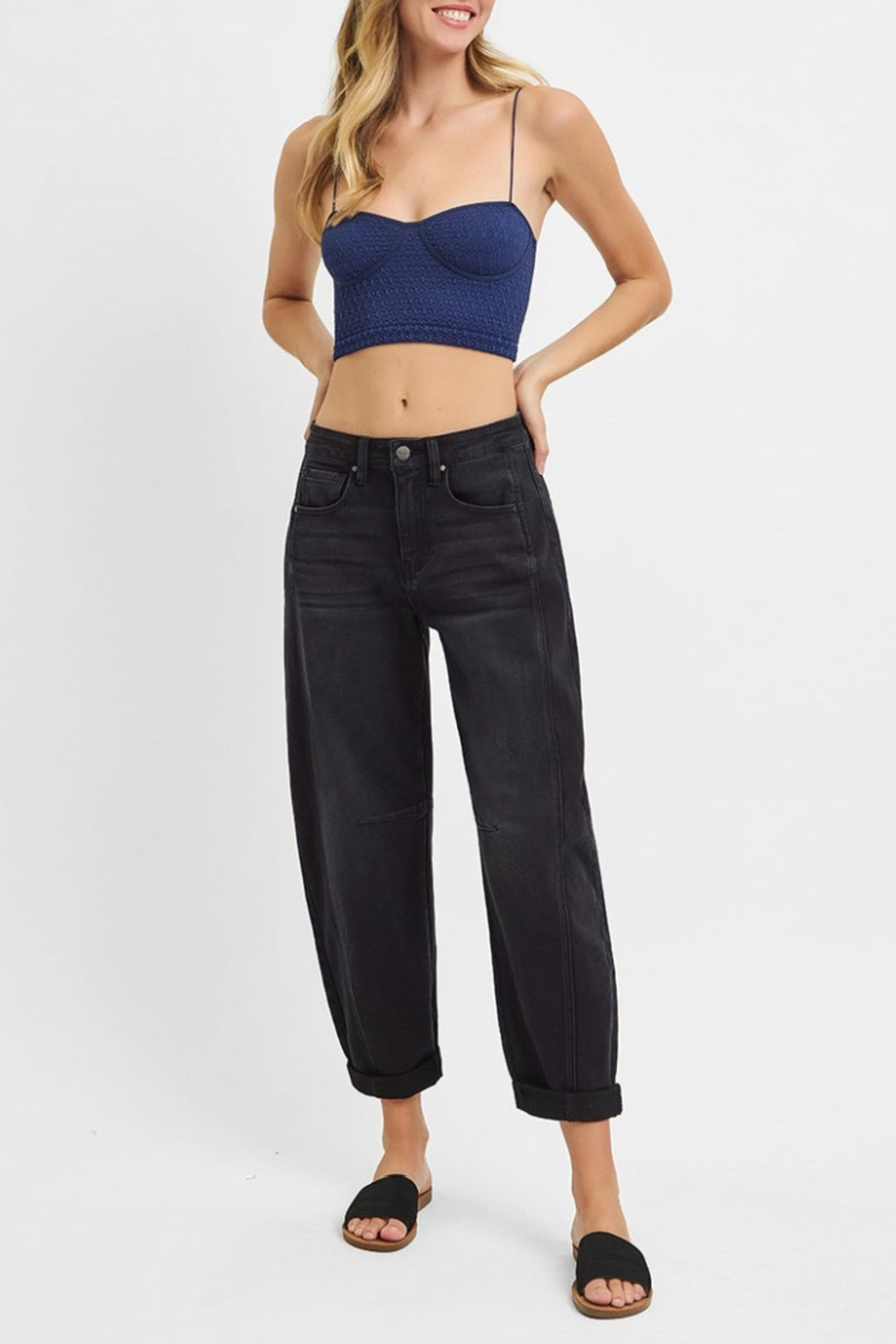 High Rise Cropped Barrel Jeans. See pictures for size chart. - Rise 10 1/2" | Inseam 25 1/2" (after cuff) 28 1/2" (before cuff) in size 3/26 - Model Info: Height 5'9" | Waist 24" | Hips 34" - Model is wearing size 1 - Cuff can be released 64% Cotton 22% Polyester 12% Rayon 2% Spandex