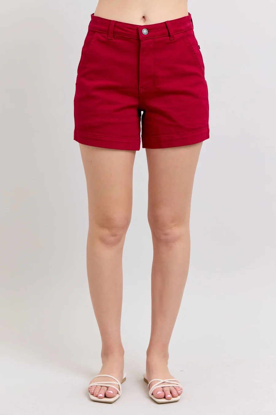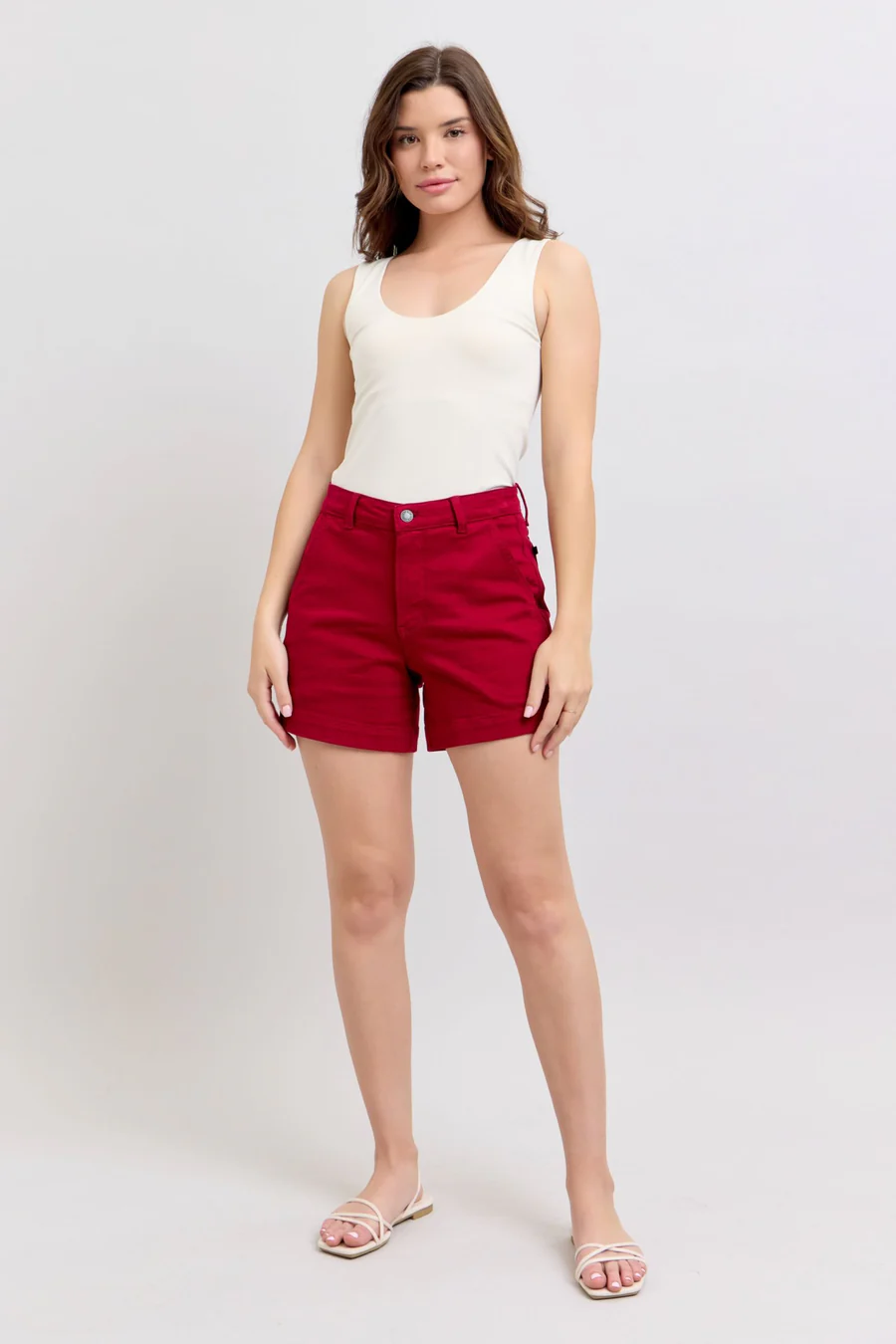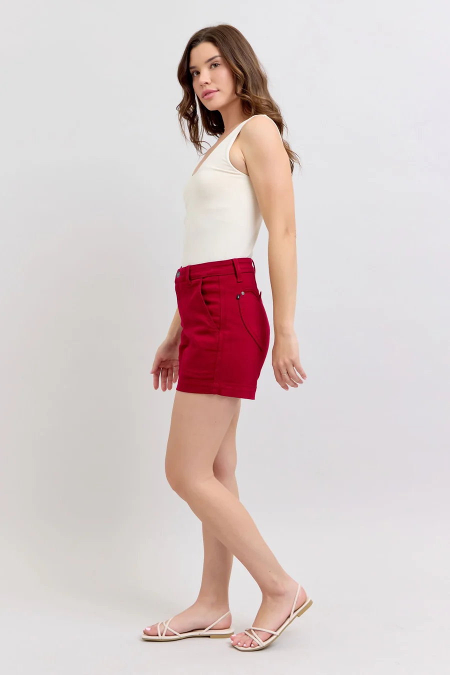 SCARLET GARMENT DYED HIGH WAIST TUMMY CONTROL HEART SHAPED POCKETED TROUSER SHORTS