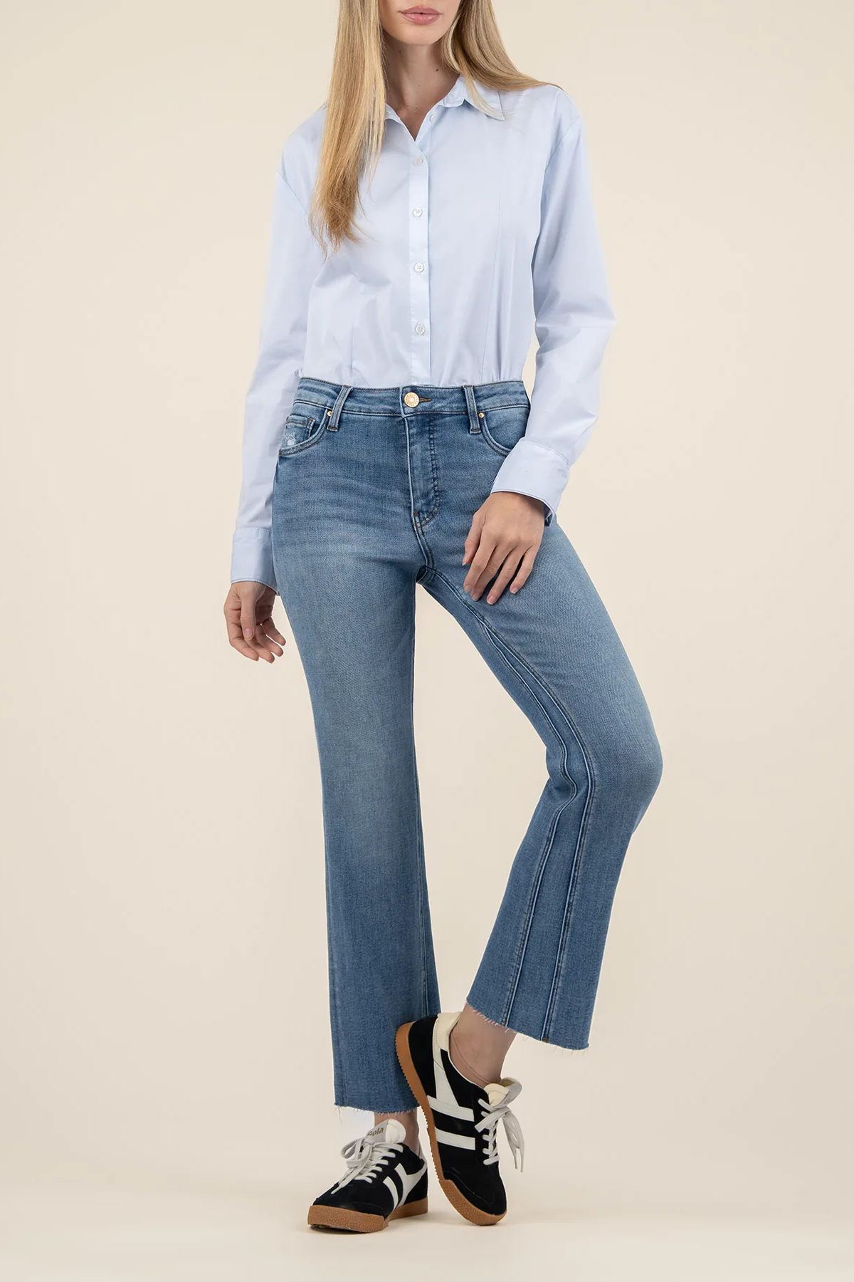 Ankle-grazing raw hems further the vintage-inspired style of stretchy flare jeans cut from stretch denim in a faded wash.