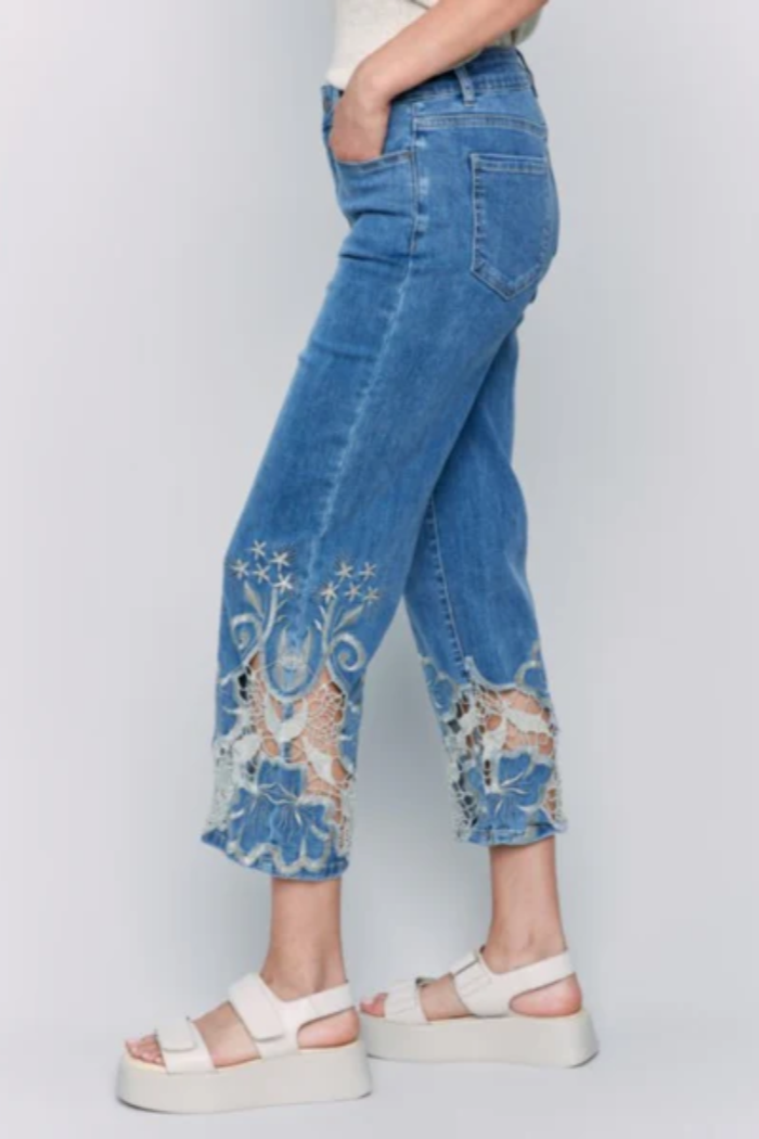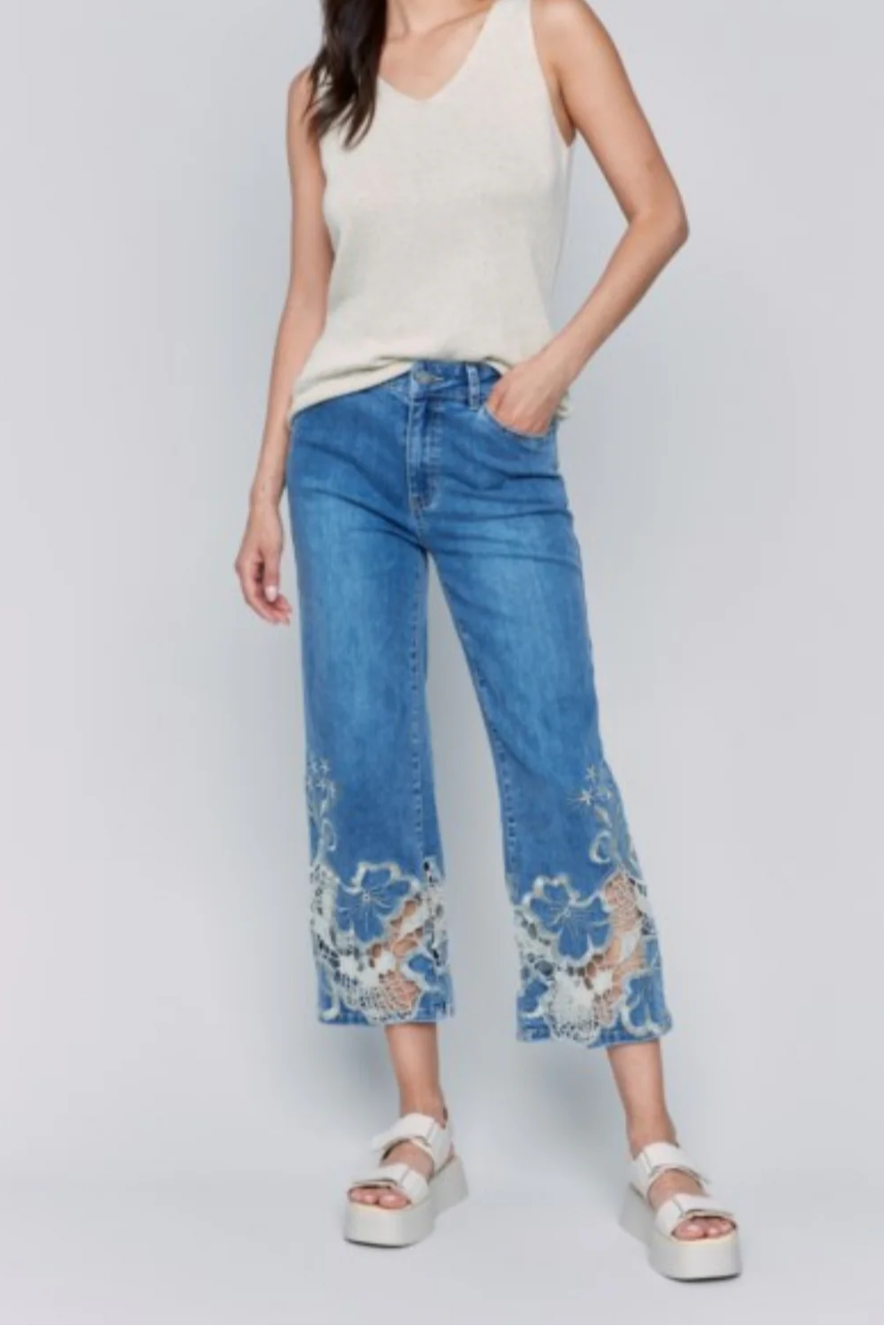 Expertly crafted in soft stretch denim, the CHARLIE B C5648 LACE CUT FLARE LEG PANT features a flattering flare leg silhouette. Adding a touch of femininity, laser cut lace adorns the bottom of the pant. Opt for comfort and style with this versatile crop jean. The classic design includes five functional pockets and a zipper and button closure.
