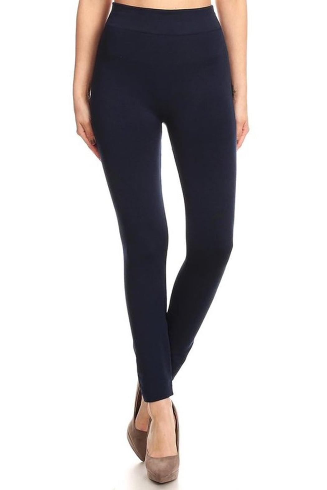 Navy, ankle length fleece lined leggings with wide waistband. One size fits most.