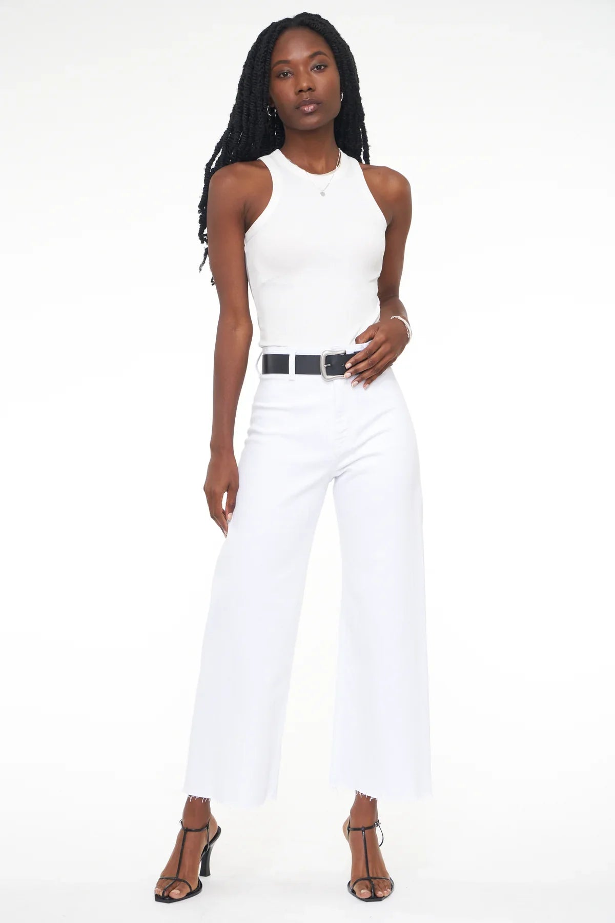 This style hugs your waist and widens from the hips. No side seams with a sleeker silhouette. The Penny comes in a crisp white denim and features distressing at the hems It is a super high rise cropped wide leg pant with a scissor cut hem. 99% Cotton / 1% Elastane