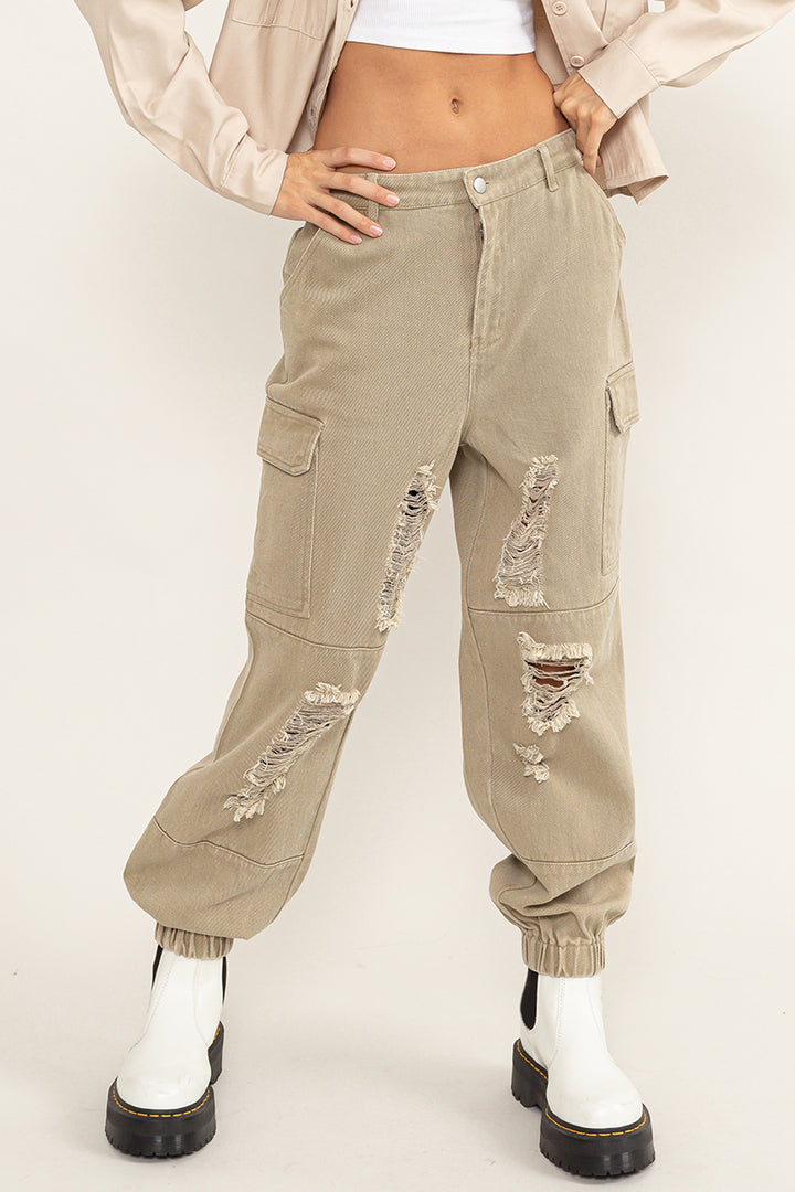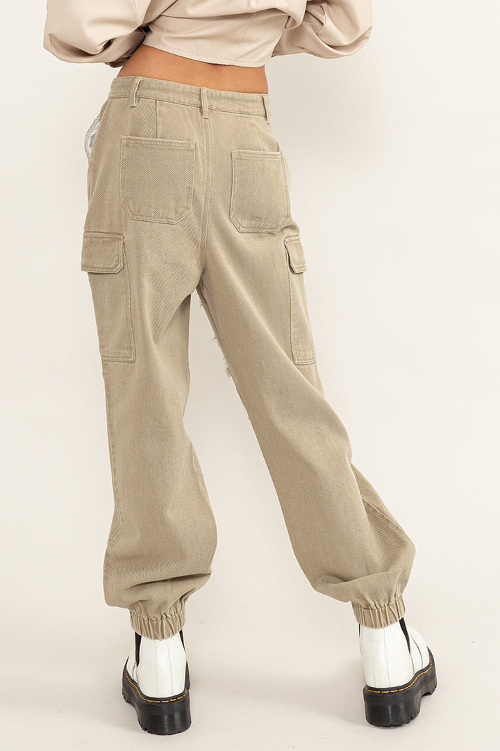 Bring the modern vibes to any outfit with these cargo pants! Featuring a mid-rise fit for a flattering look, while the distressed detailing adds up to its laid-back appeal. Finish these beauties off with tapered pant legs, useful pockets, and cinched elastic hems, and you've got your NEW favorite pants!