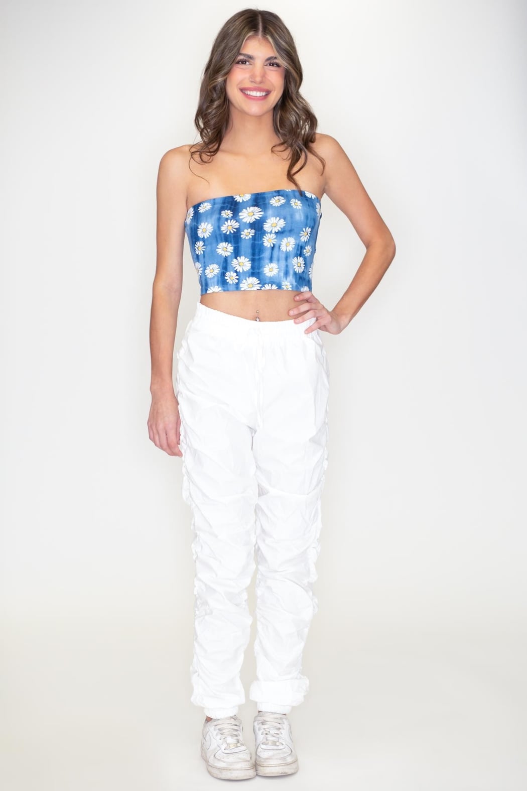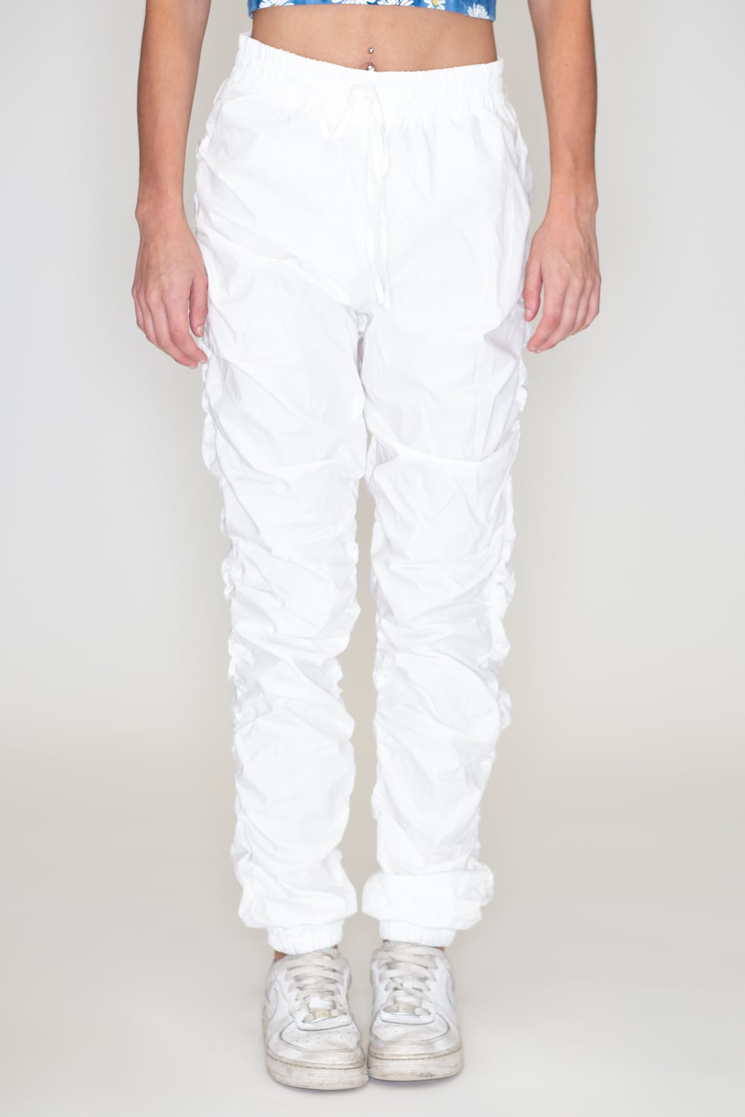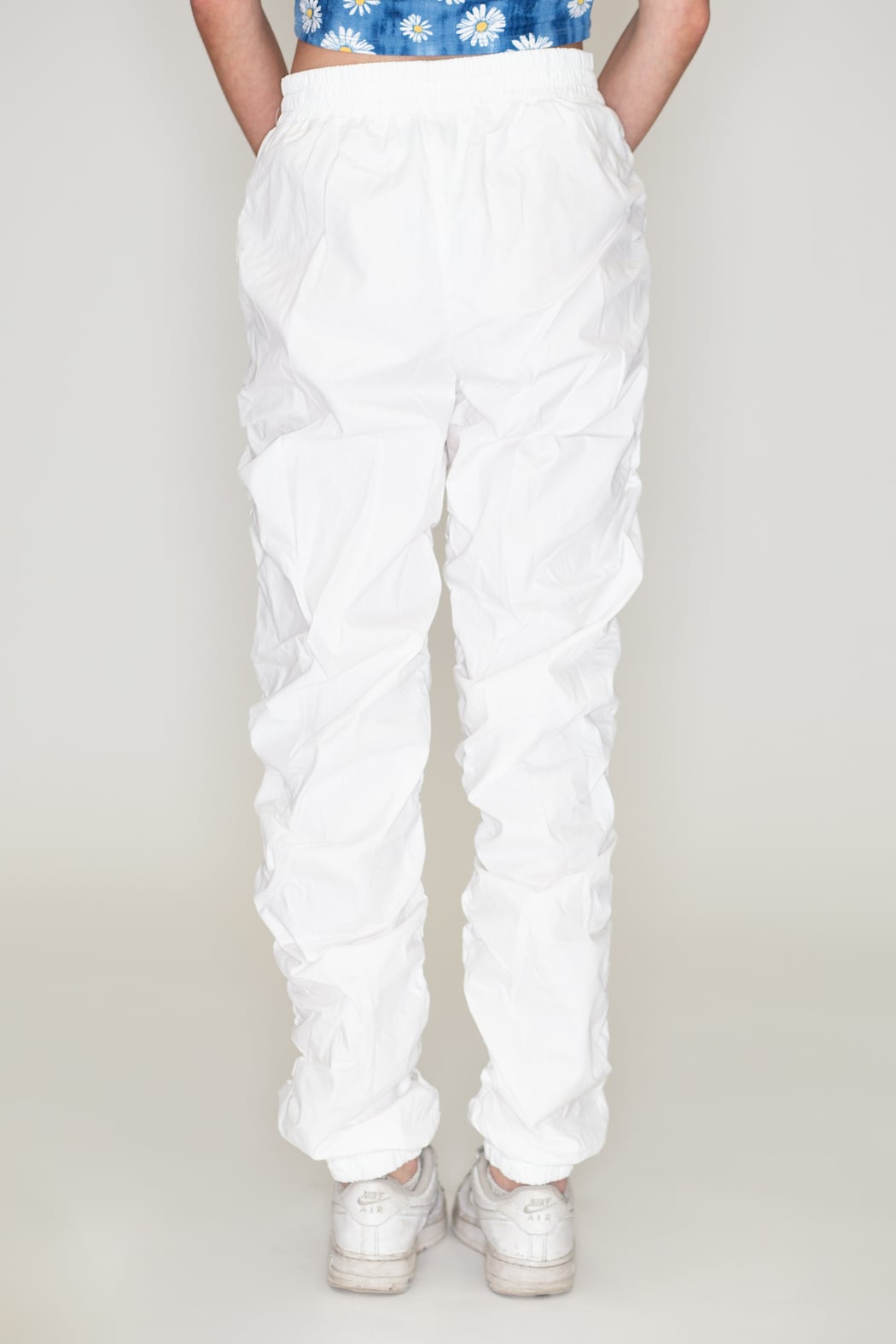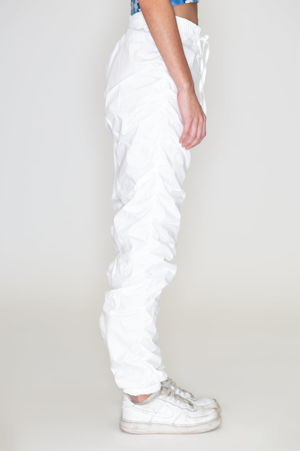 These pants are sure to elevate any look! Featuring elasticated high waist with drawstring for a flattering look, the parachutte silhouette is detailed with ruching throughout that offers a trendy style. Cinching elasticated cuffs finish off the look.