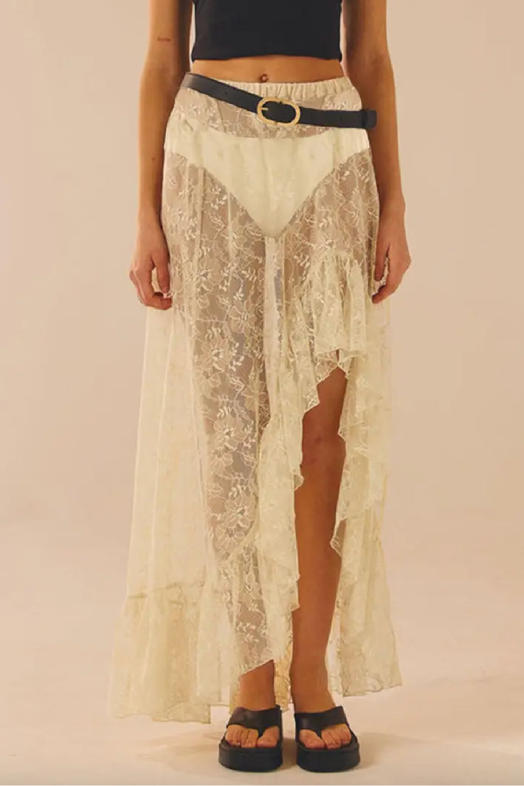 Hi-low, sheer lace maxi skirt with ruffle trim and elastic waist band.