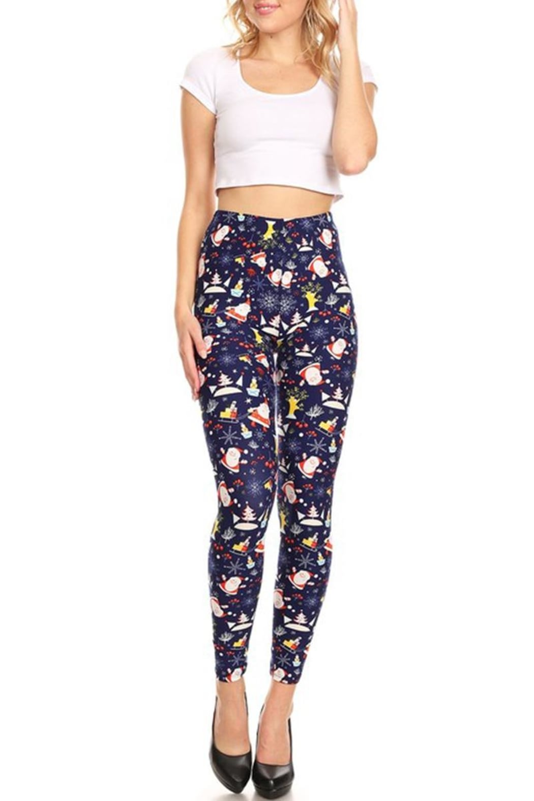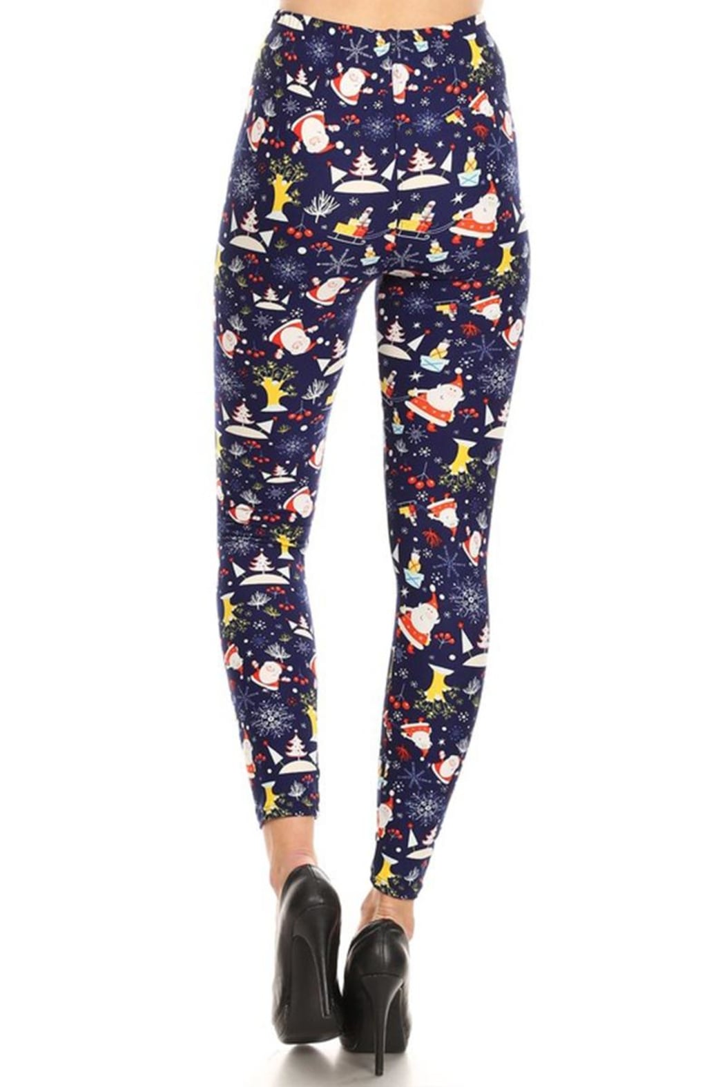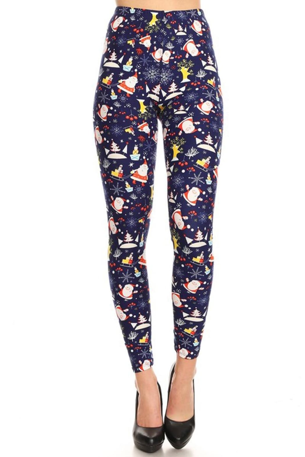 Santa Christmas print navy leggings. Full length high rise with an elastic waist band. Buttery soft and smooth fabric. Stretches well. One size.