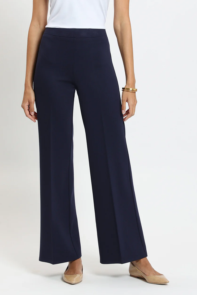 Our Trixie pant is a fan favorite! Featured in our solid stretch knit Jude Ponte, it's a pull-on wide-leg pant with an elastic waistband that sits on the hip. The width of the legs provides a loose and flowing silhouette, creating a more relaxed and comfortable fit while still looking stylish and polished.