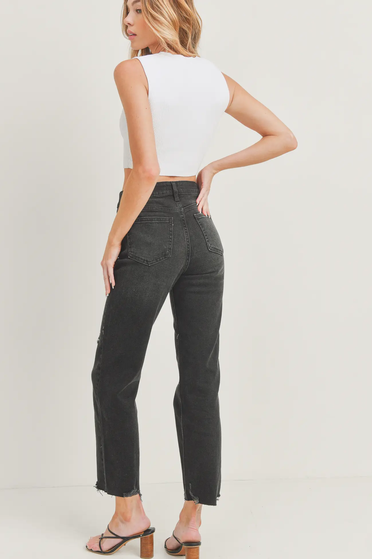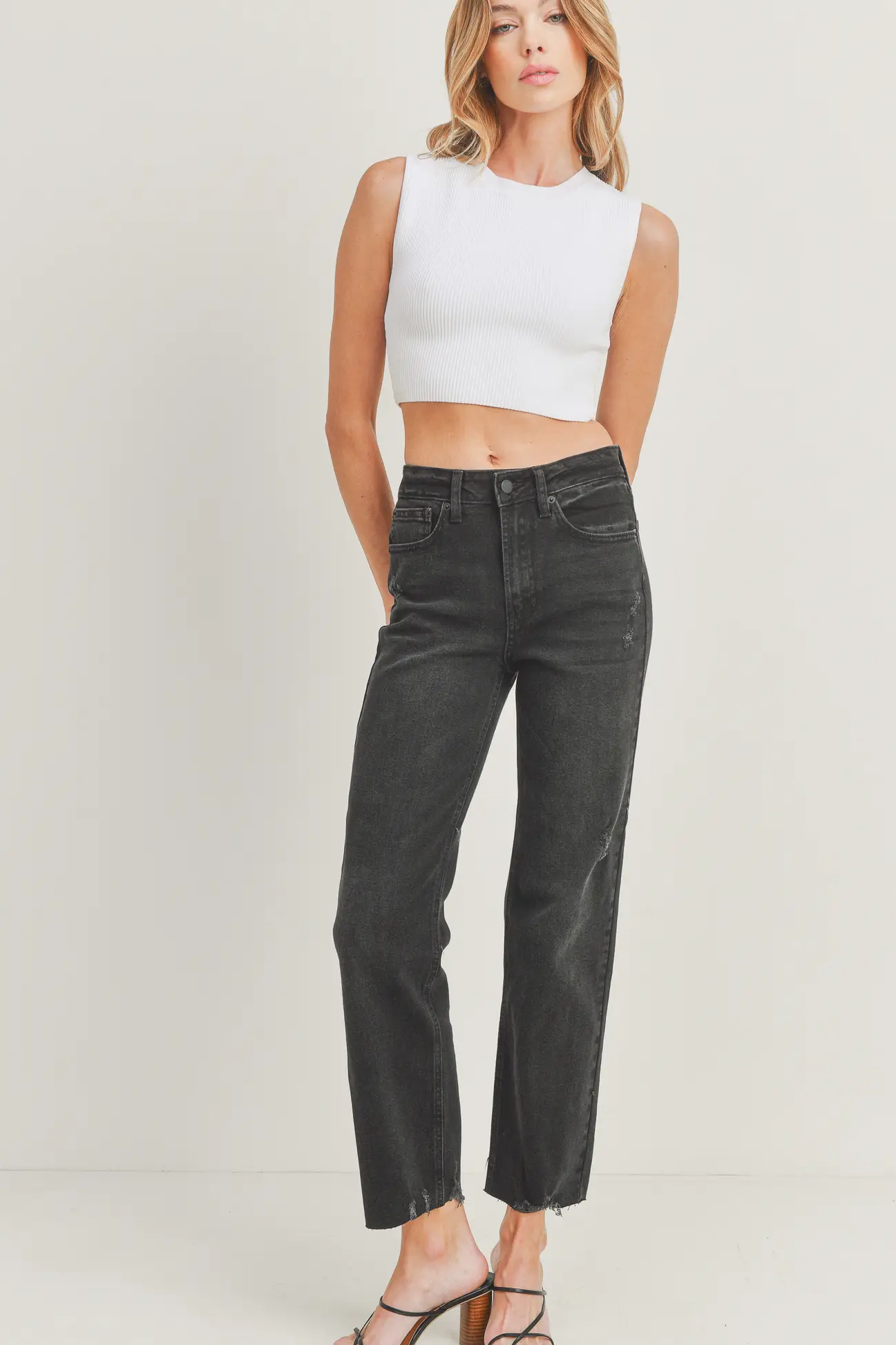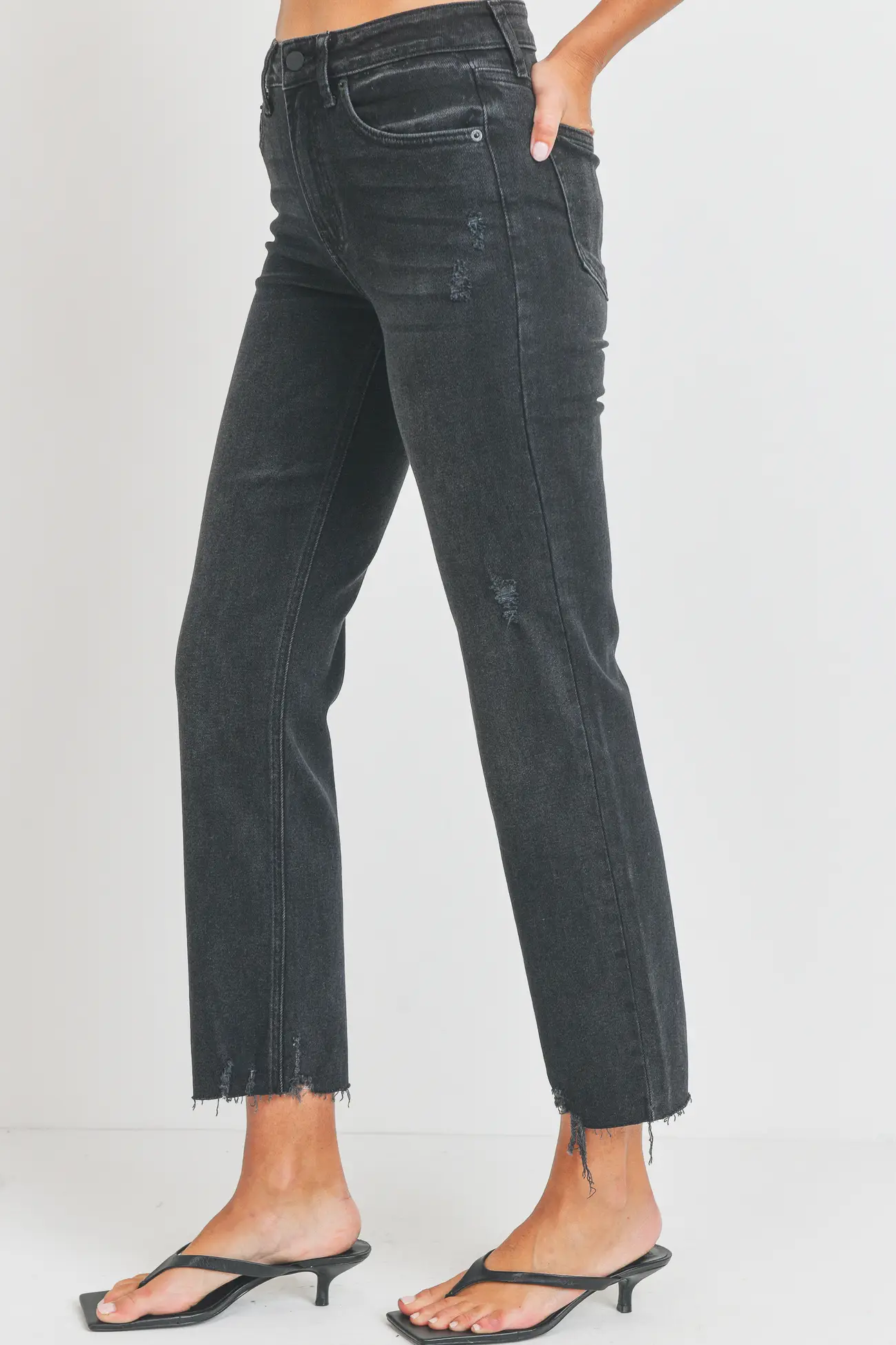A high rise, washed black jean that’s essential for your wardrobe’s transition to fall. This straight leg classic has a raw hem with detailed distressing to add extra interest