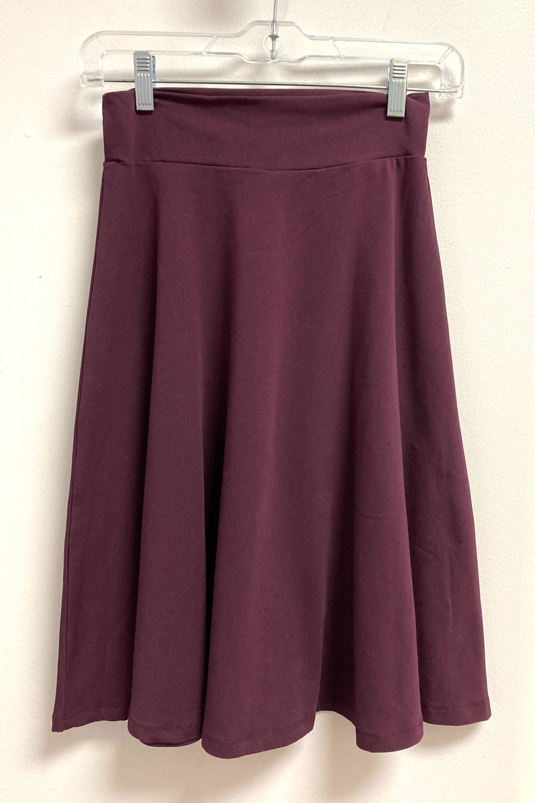 Fit and flair, pull on, knee length skater skirt. The skirt is 23" from the top of the waistband to the bottom of the skirt.