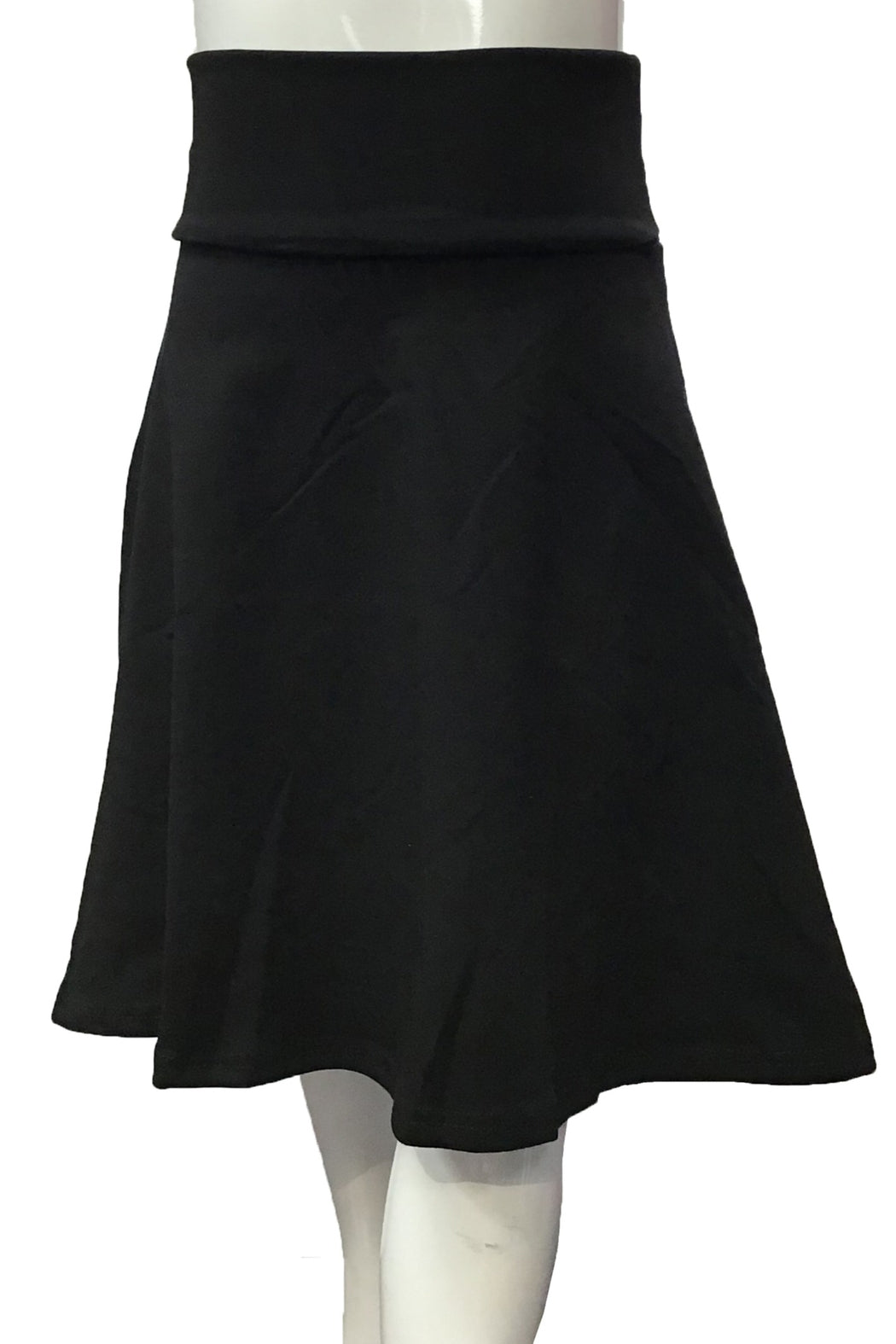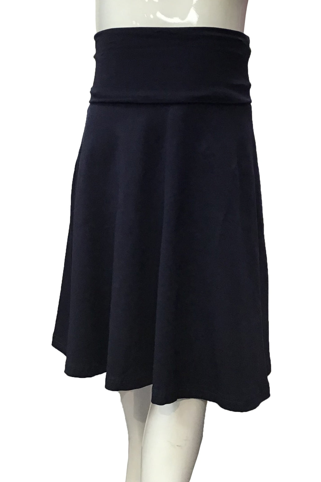 Cotton, pull on, foldover skater skirt. Easy to wear. Easy care. Knee length.