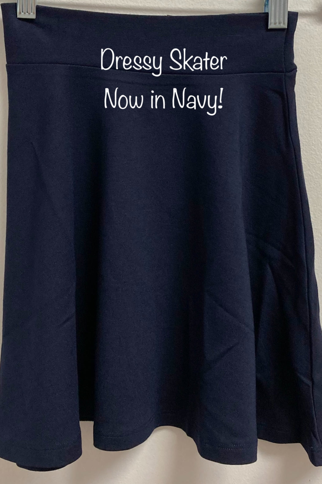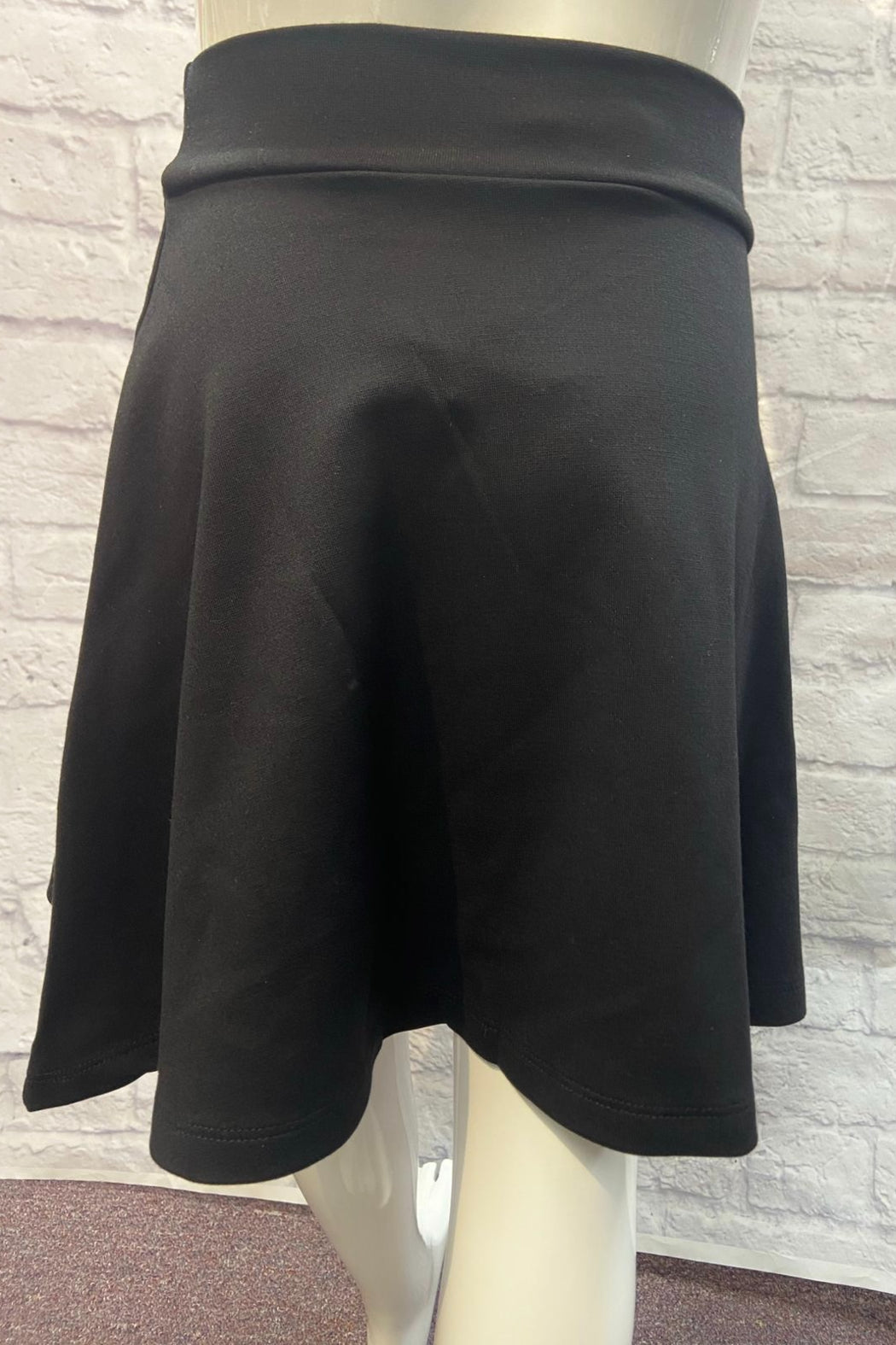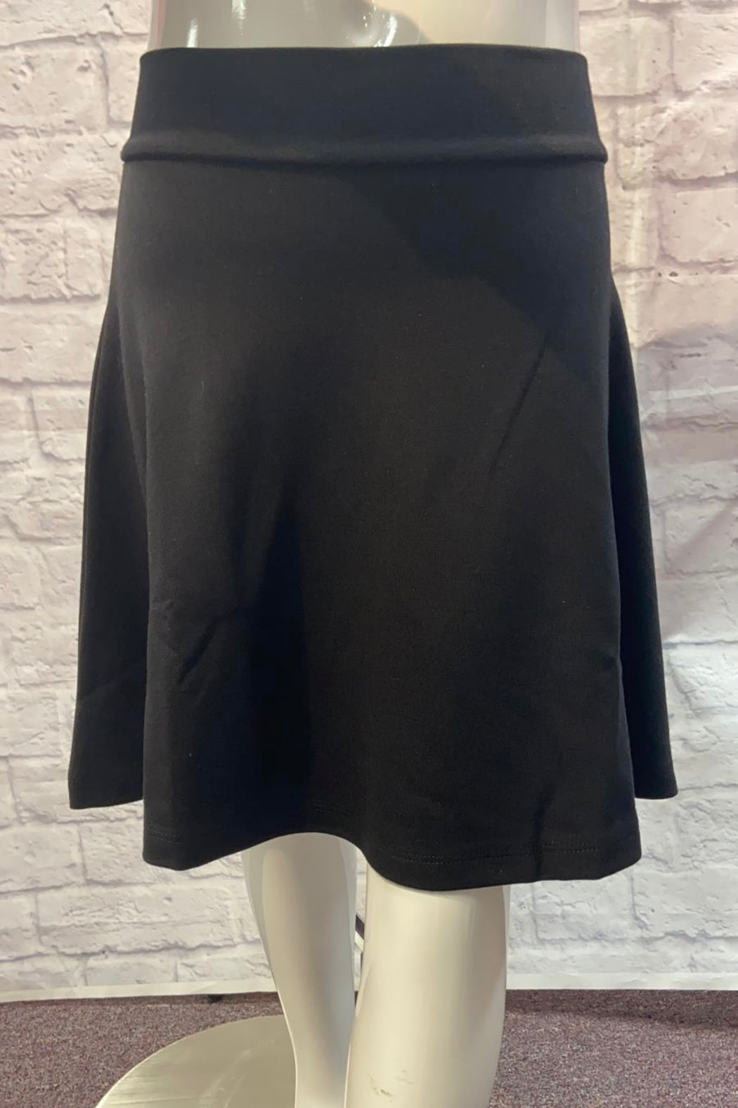 Dressy skater skirt. Black color stays dark black. Very comfortable pull on style. Can be dressed up or worn for everyday. Knee length or below the knee. The lengths for each size are as follows: XS 14.5", S 15", M 17.5", L 18.5", XL 19.5"