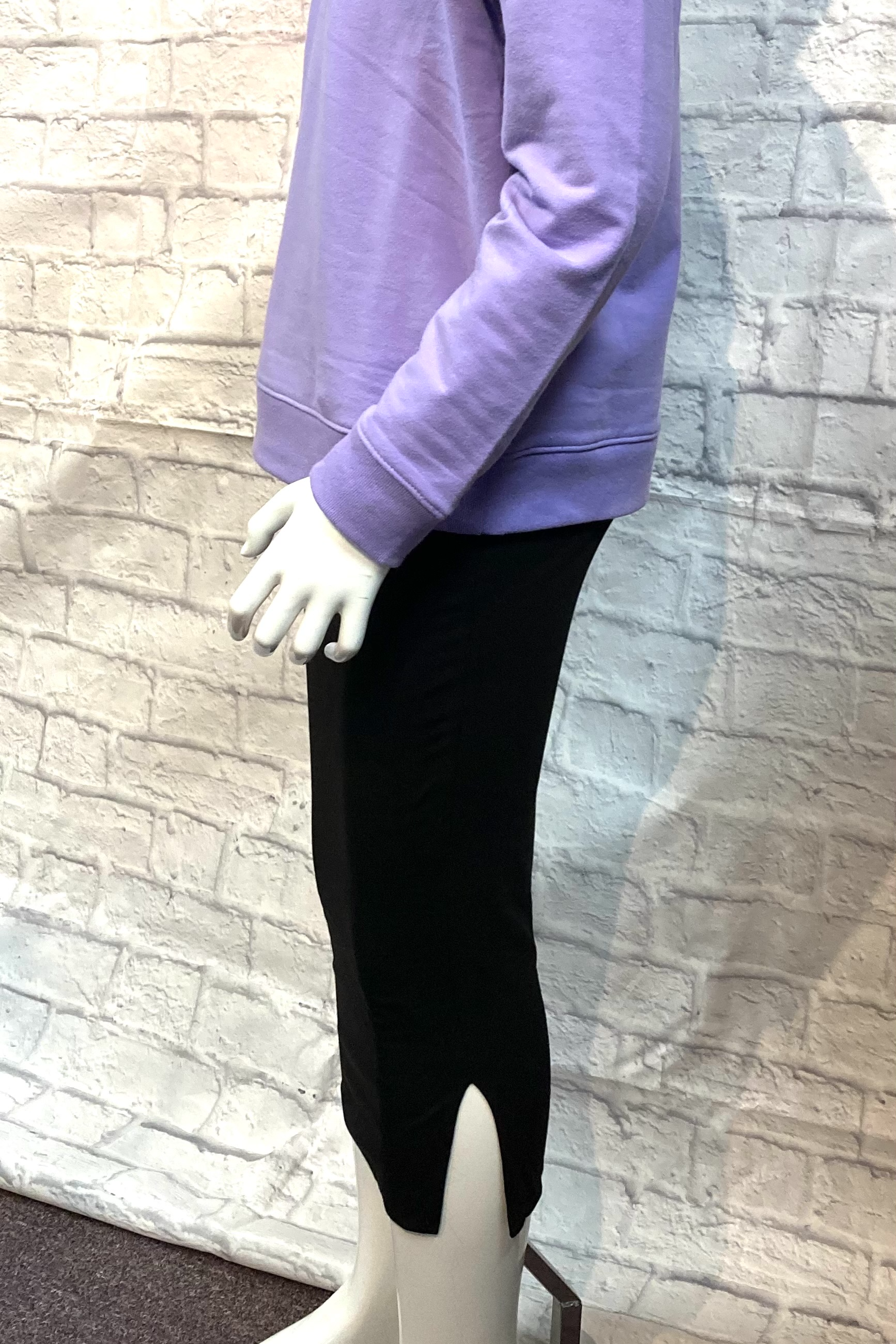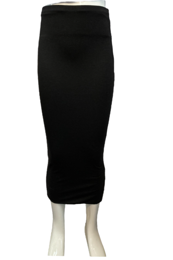 Tight fitting midi skirt with 5" side slit. Pull on. Soft, stretchy fabric.