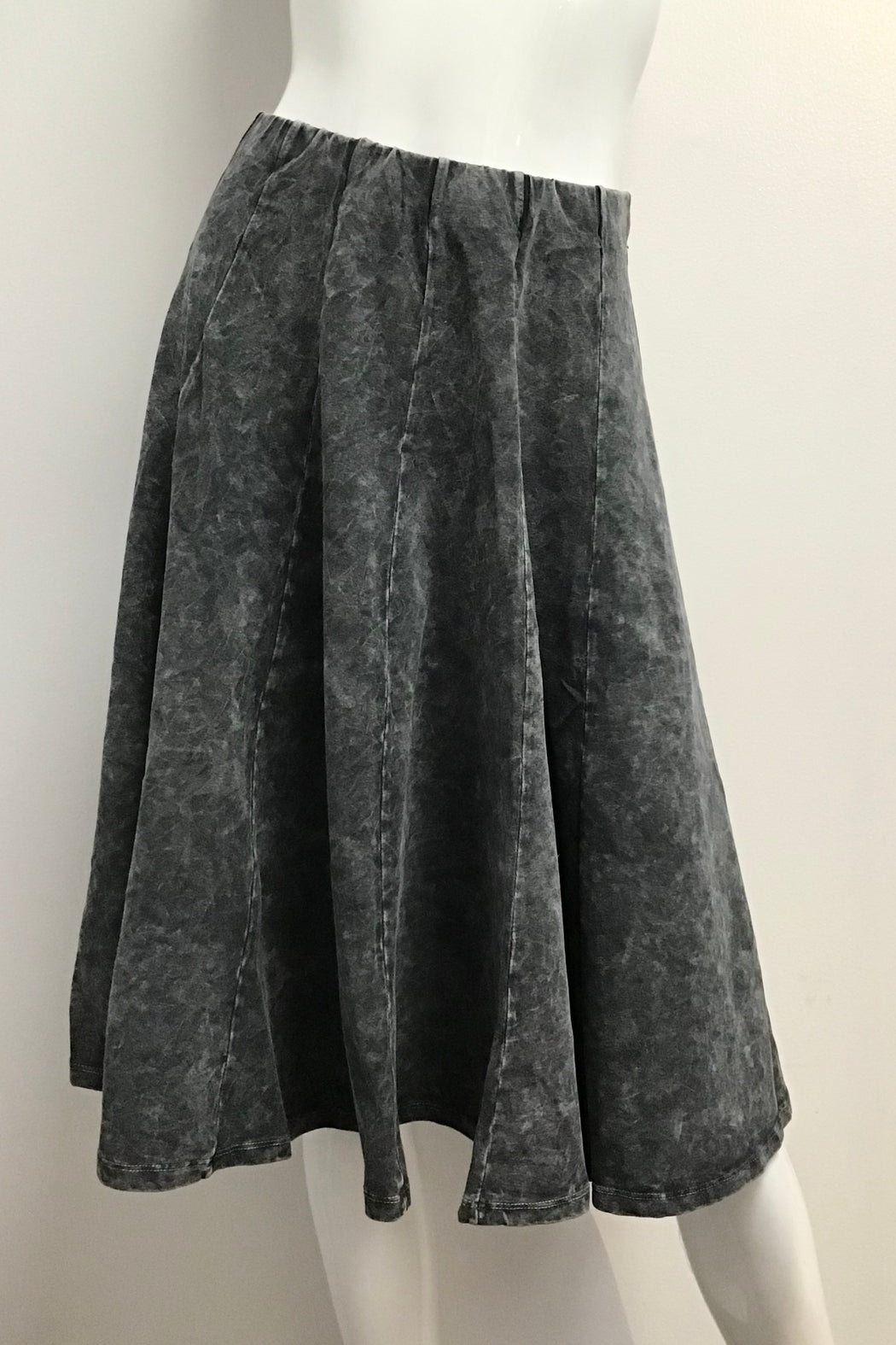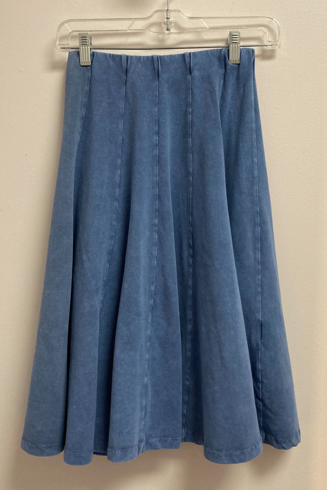Soft, pull on, mineral wash, panel skirt. Length 24-25 inches. Colors are subtle and vary slightly due to the nature of the washing process.