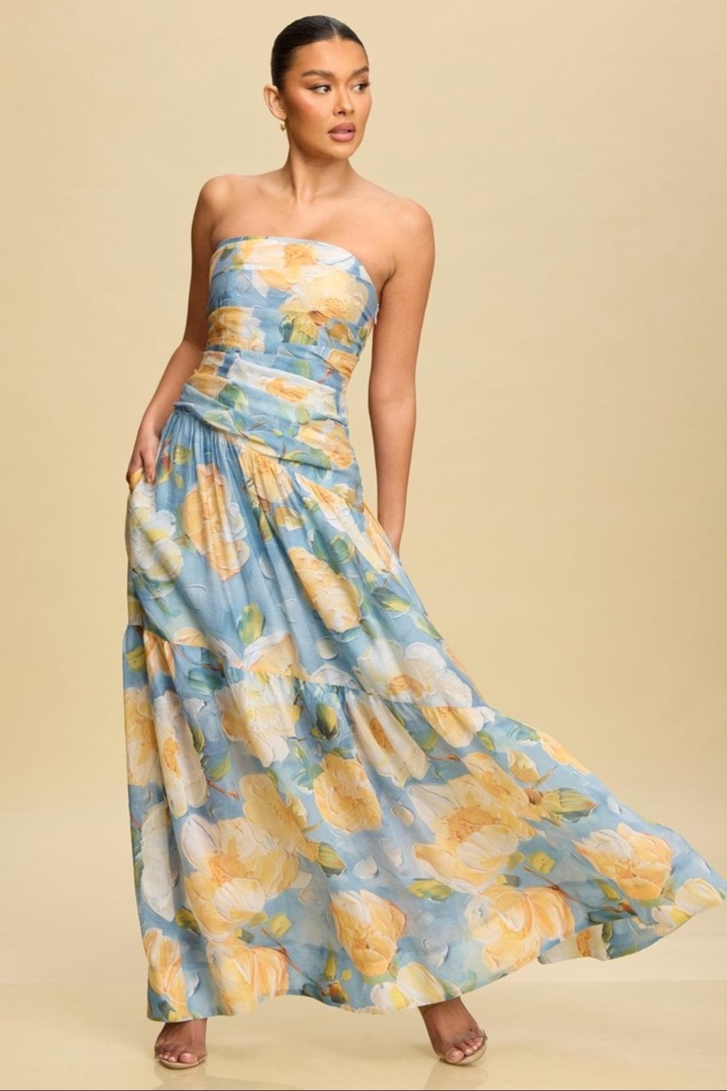 3D floral tube maxi dress with pockets. Model is wearing a size Small