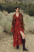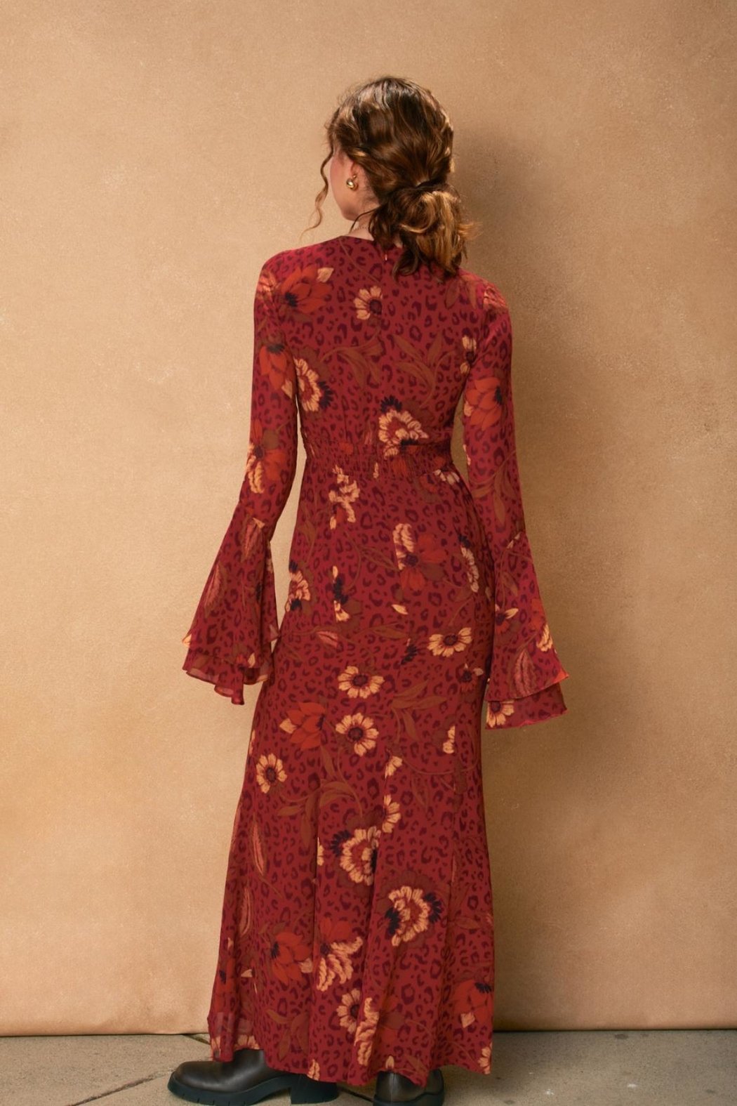 Animal floral print ruffled bell sleeve maxi dress with plunging neckline and hook and eye closure. Model is wearing a size Small
