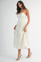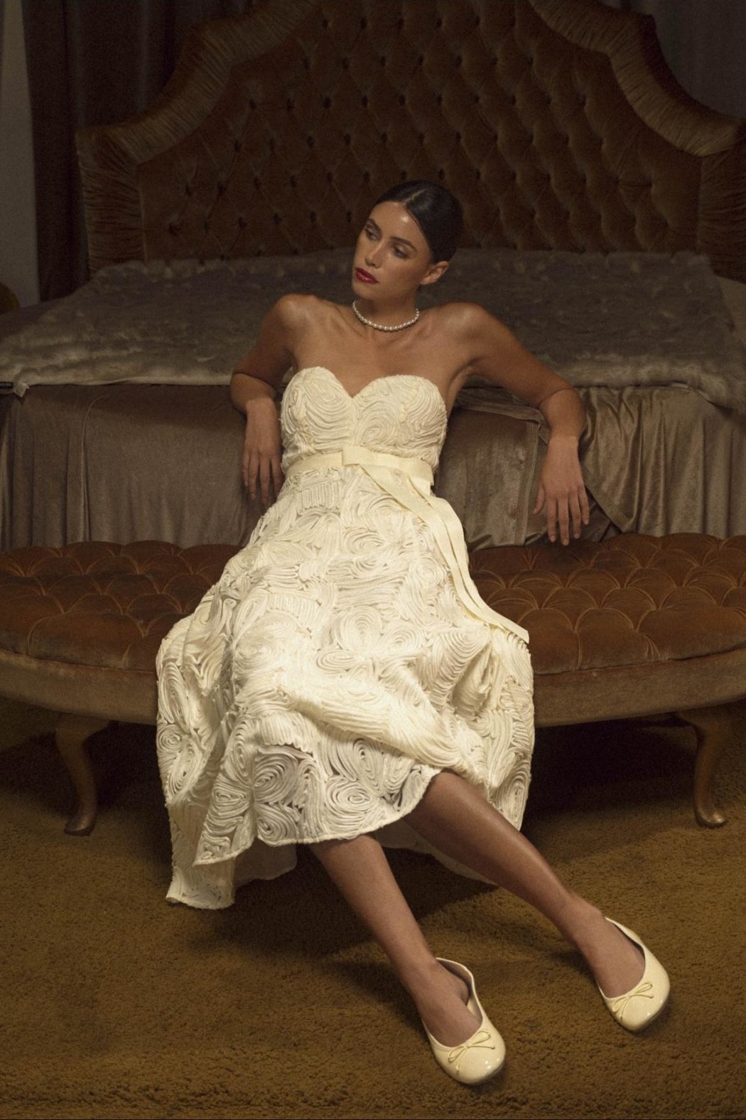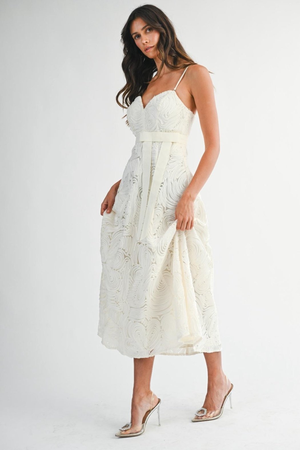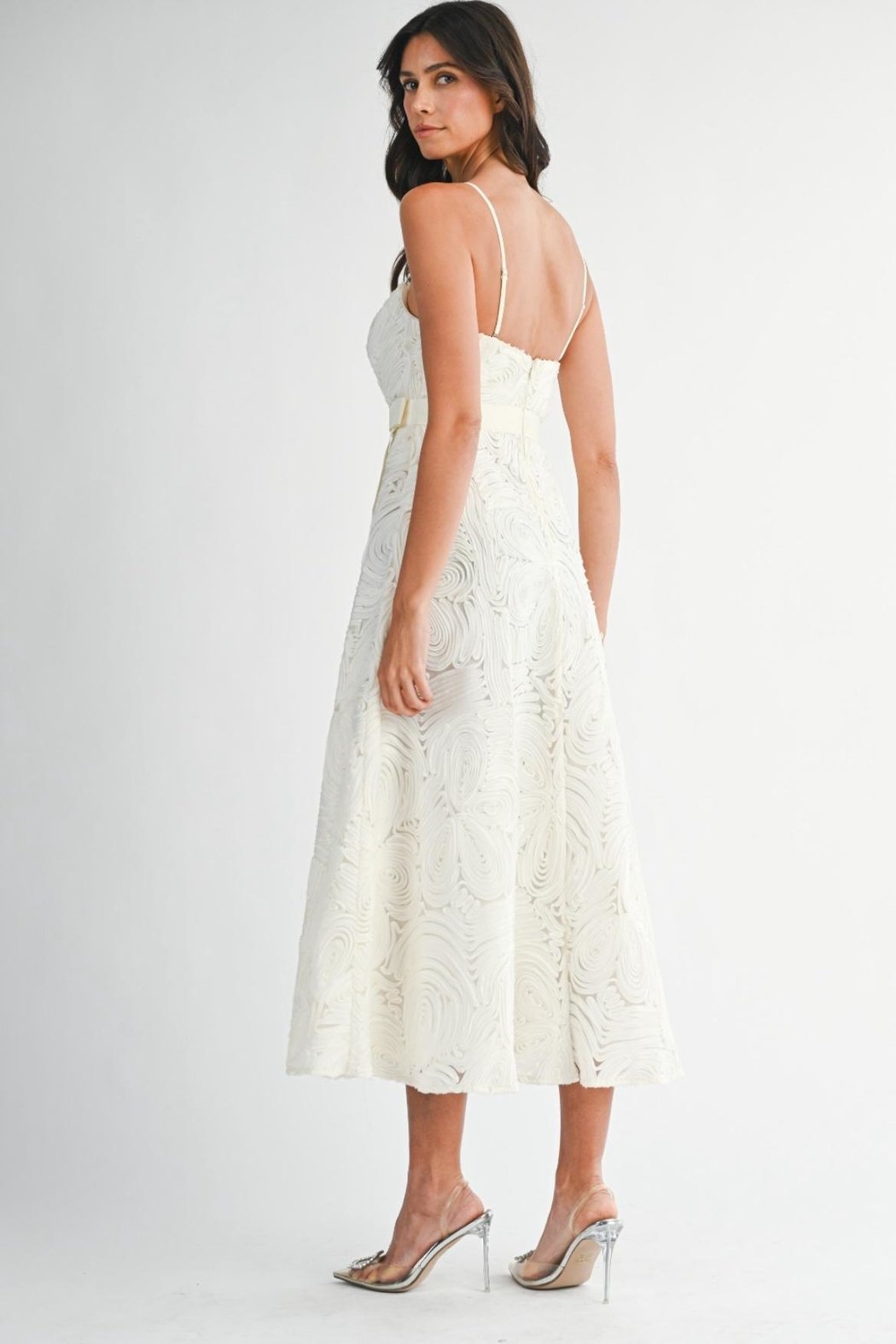Applique embellished strapless midi dress. Model is wearing a size Small
