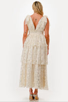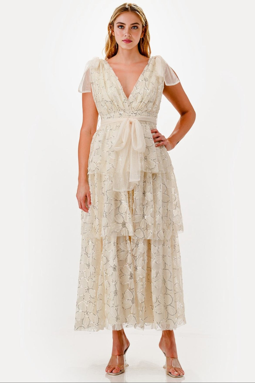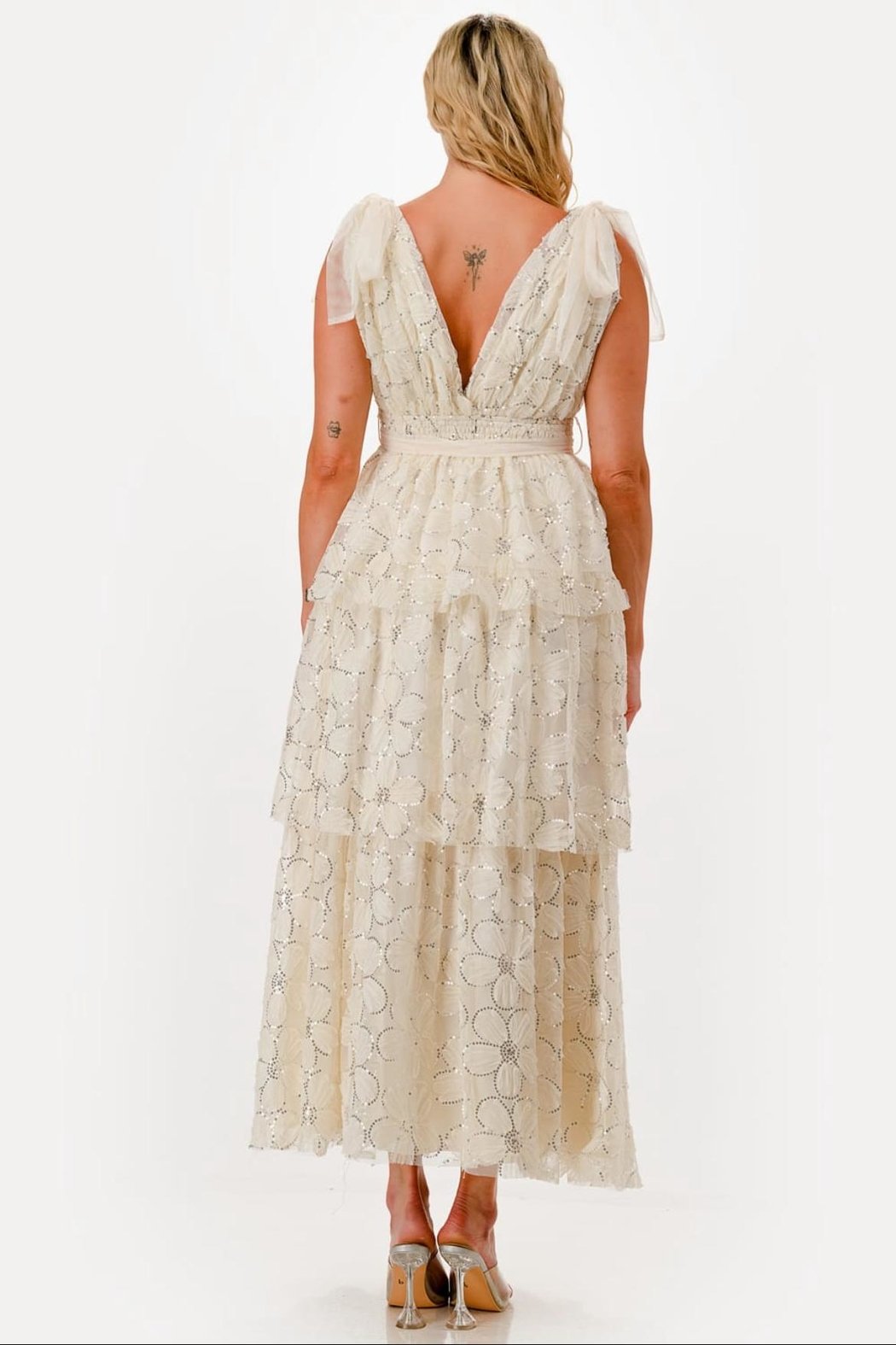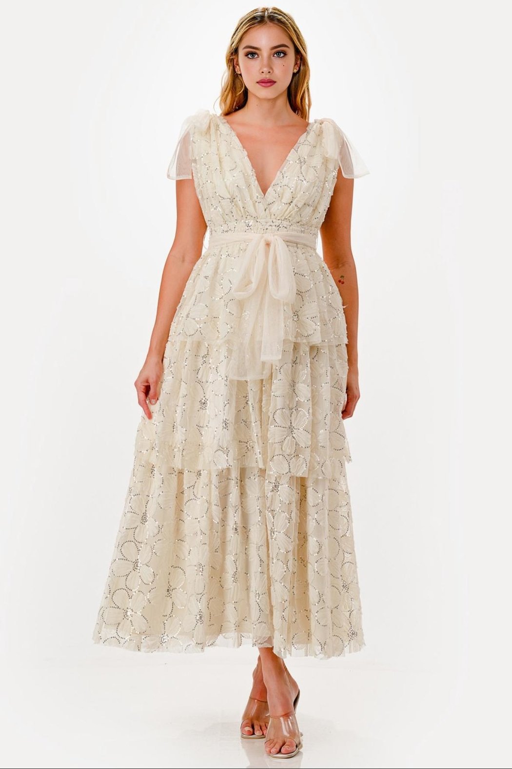Applique embellished tiered dress with sequin detail. Model is wearing a size Small