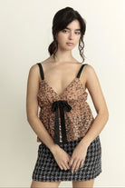 Baby doll top with ribbon front detail. Model is wearing a size Small