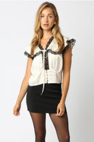 Buttoned satin top with lace detail. Model is wearing a size Small