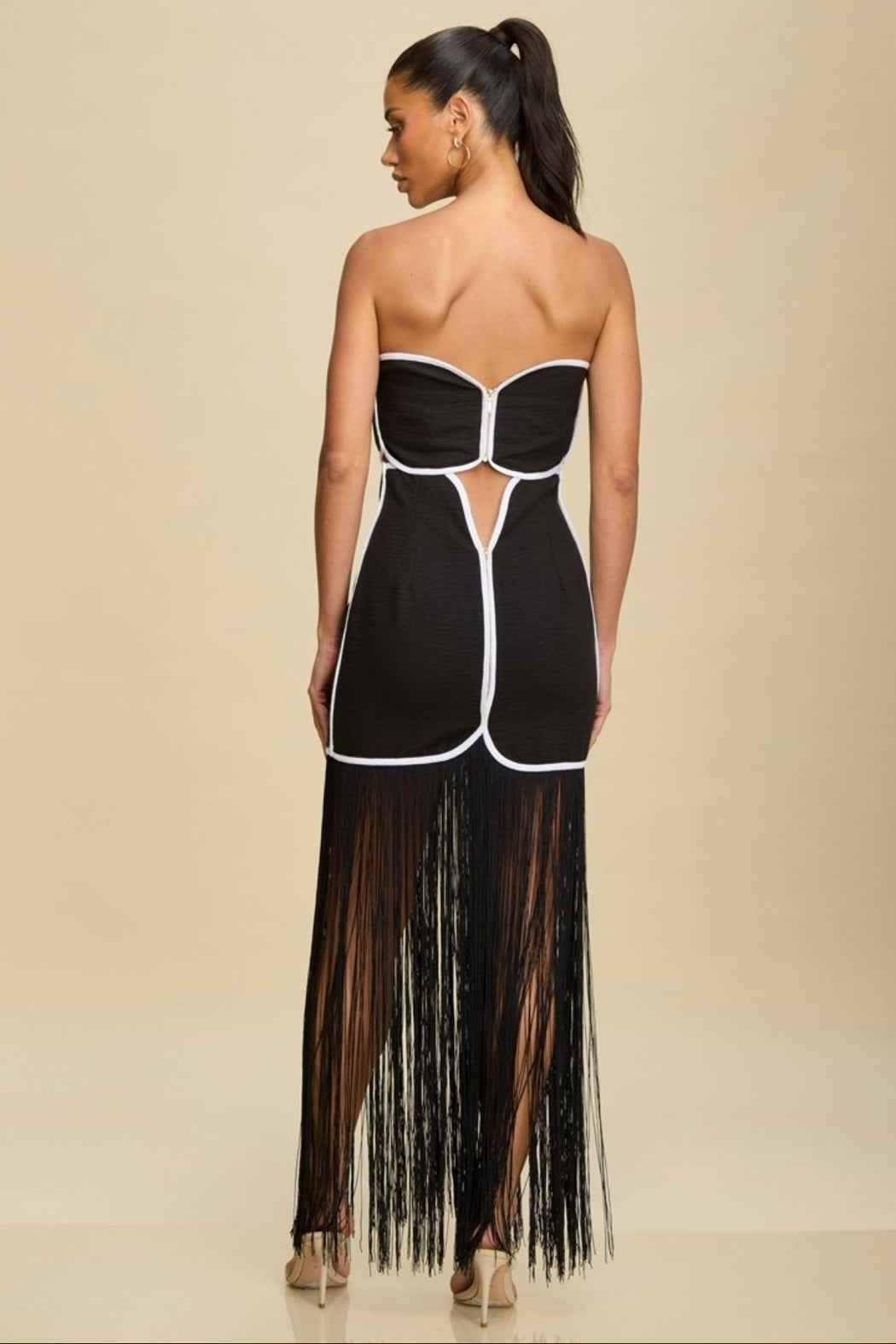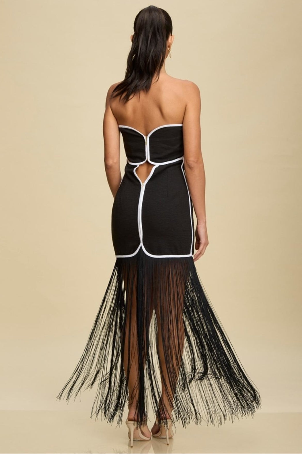 Contrast strapless front cut out dress with fringe hem. Model is wearing a size Small