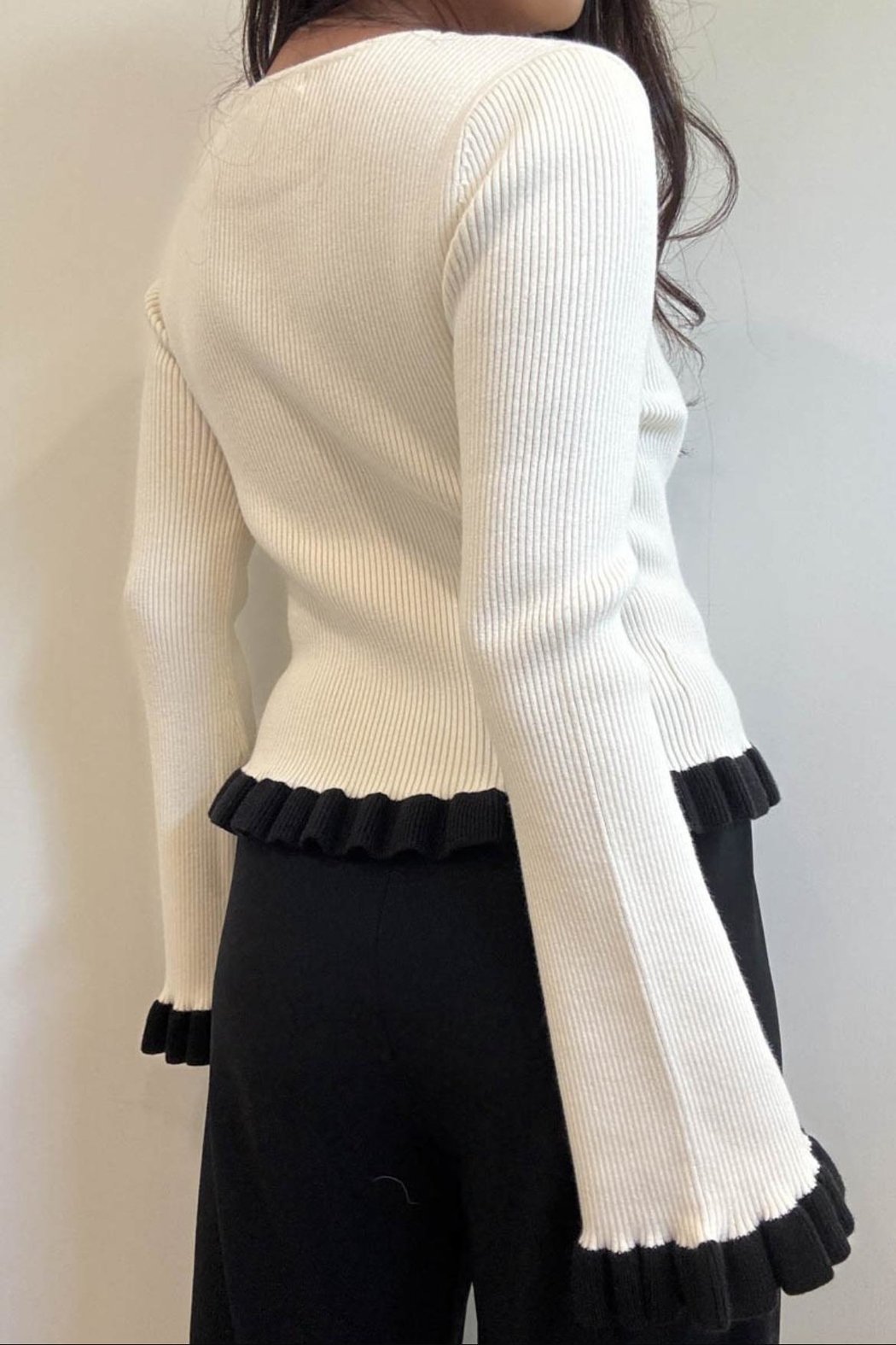 Contrast frill hem button front knit cardigan. Model is wearing a size Small