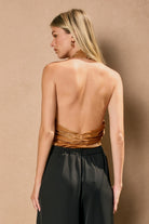 Crossover halter metallic bodysuit. Model is wearing a size Small