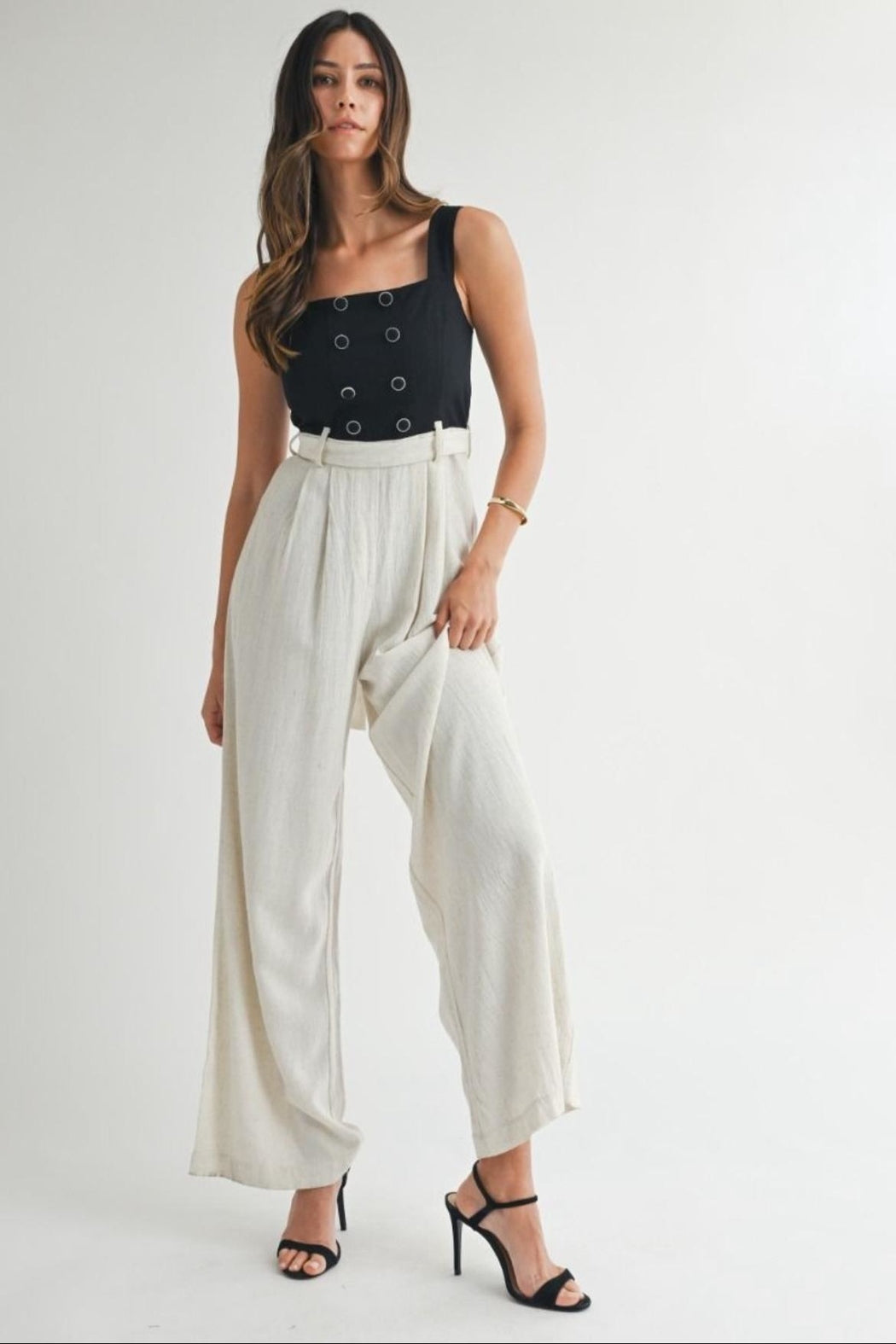 Linen blend double breasted jumpsuit. Model is wearing a size Small