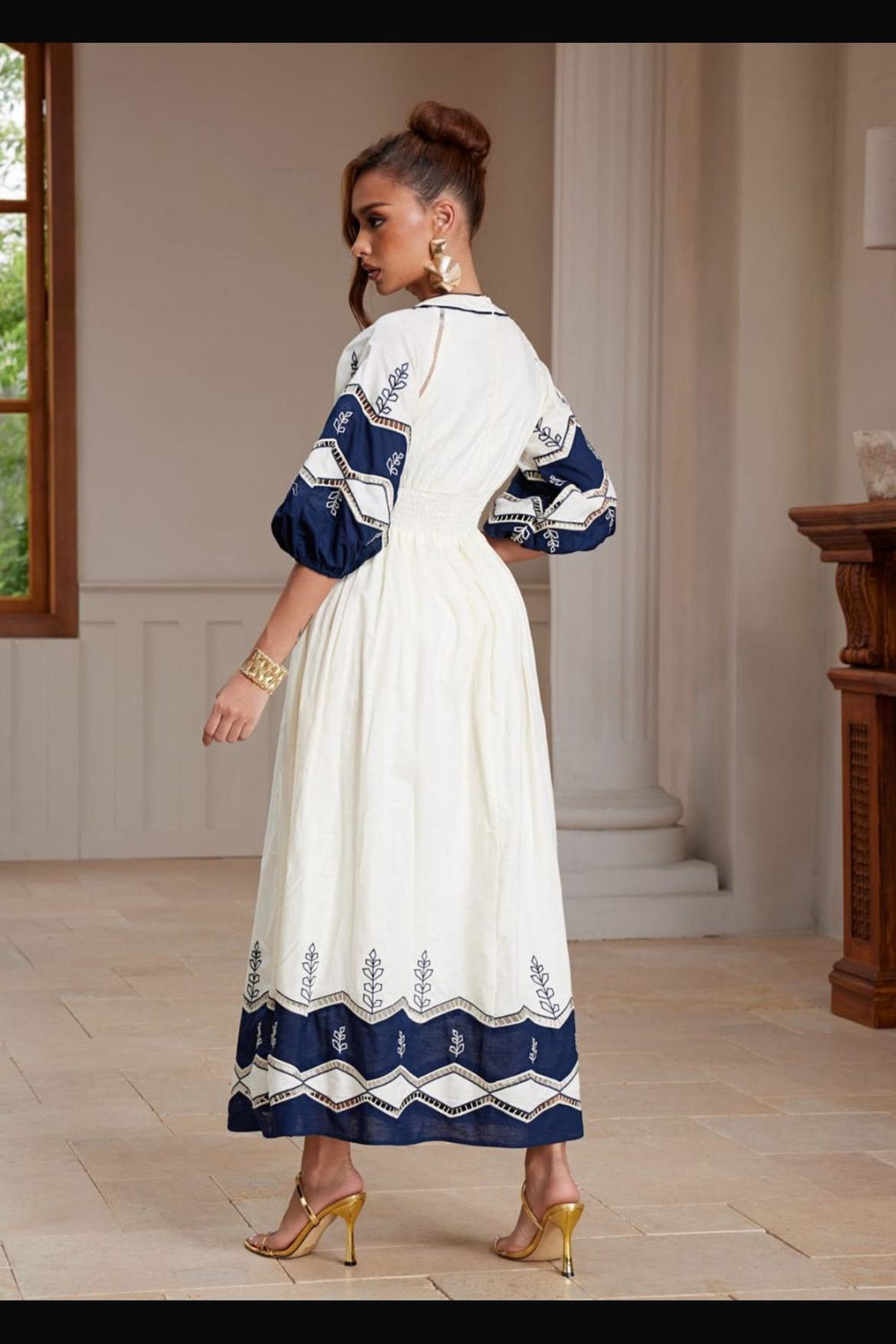Linen blend color block dress with embroidery detail. Model is wearing a size Small