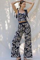 Floral embroidered tie shoulder top and pants with pockets set. Model is wearing a size Small