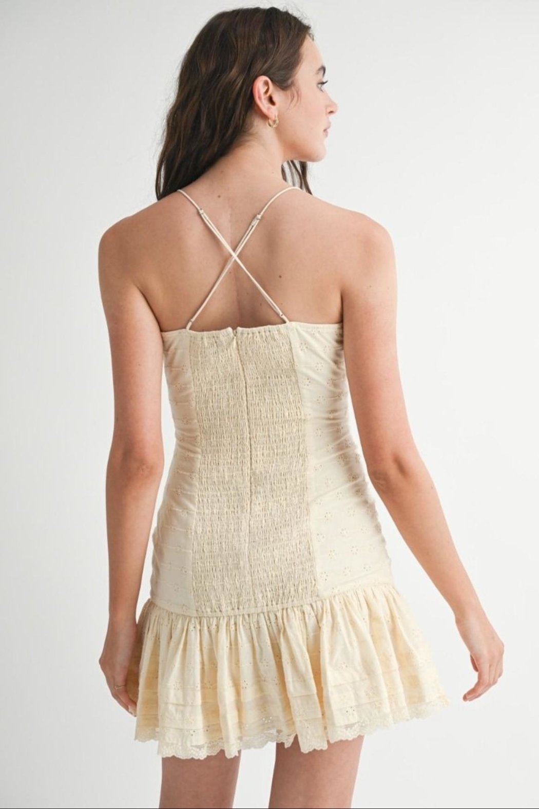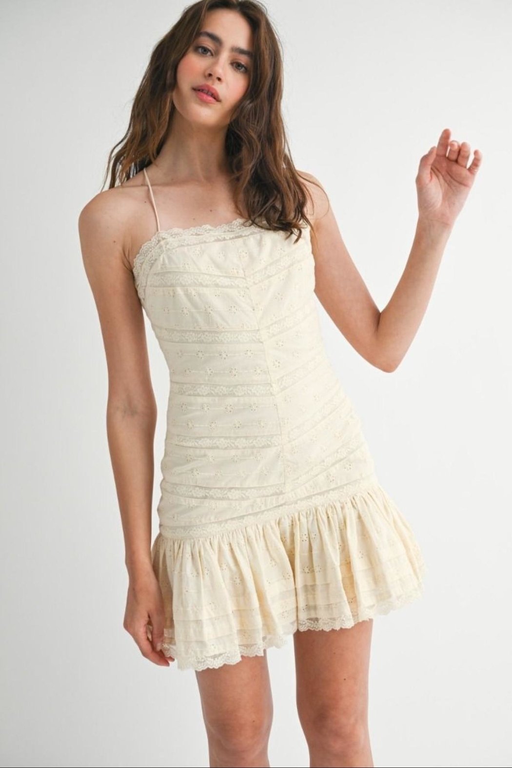 Eyelet mini dress with lace detail. Model is wearing a size Small