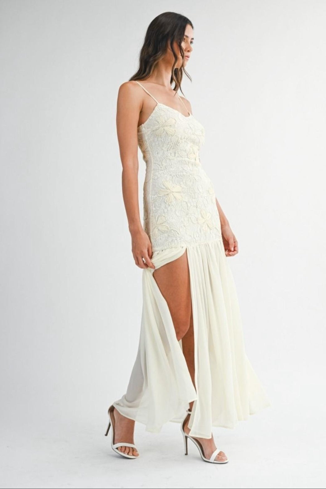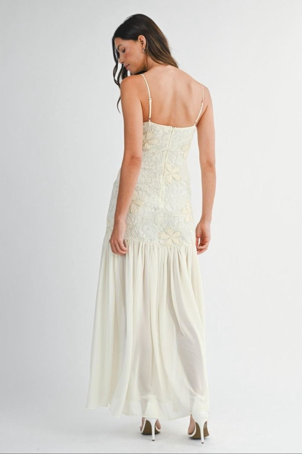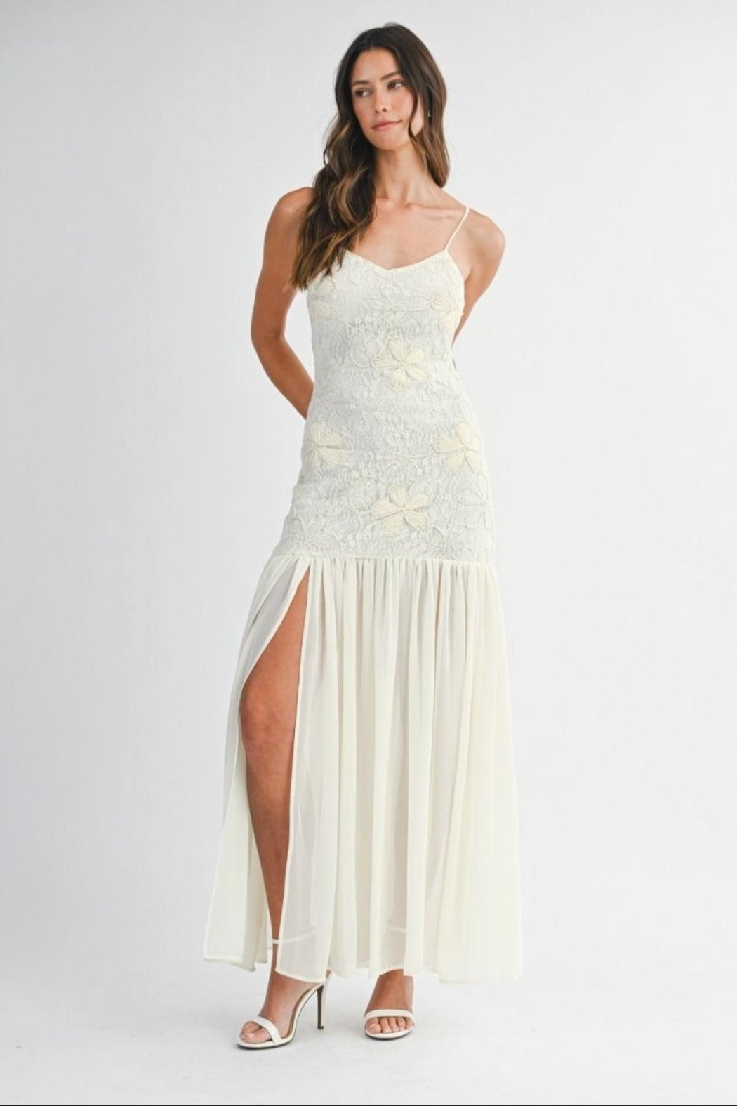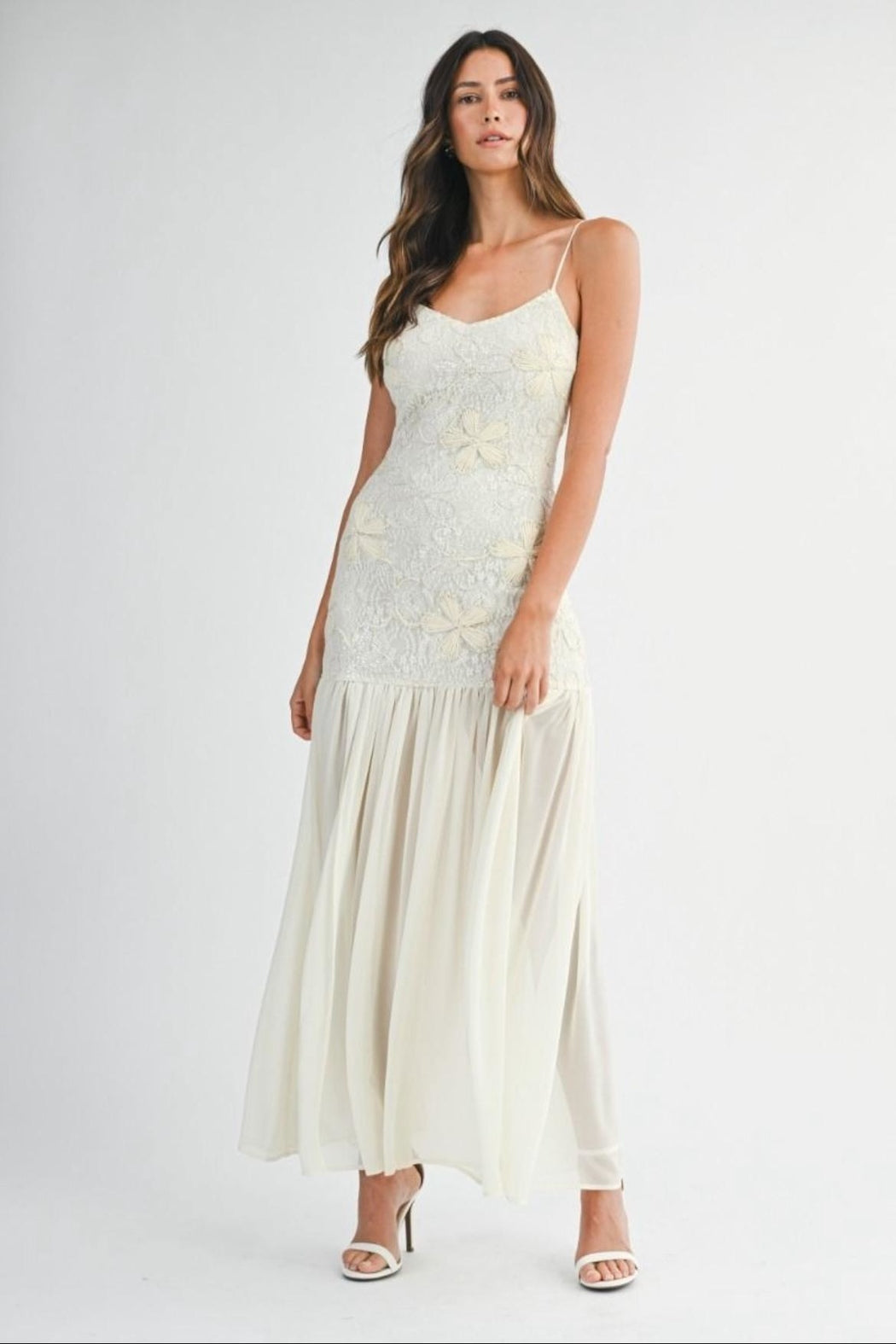 Floral applique pleated contrast dress. Model is wearing a size Small