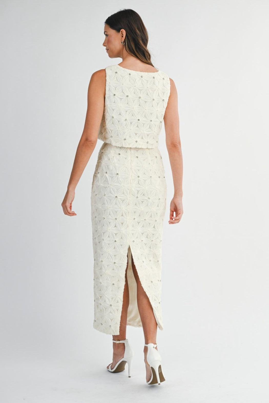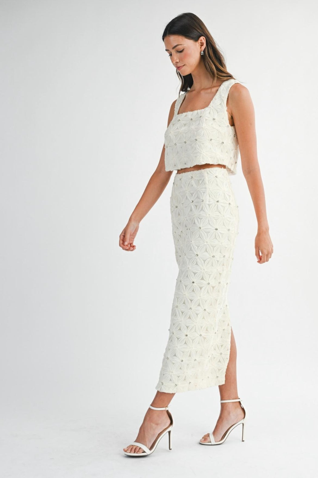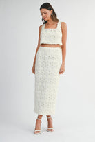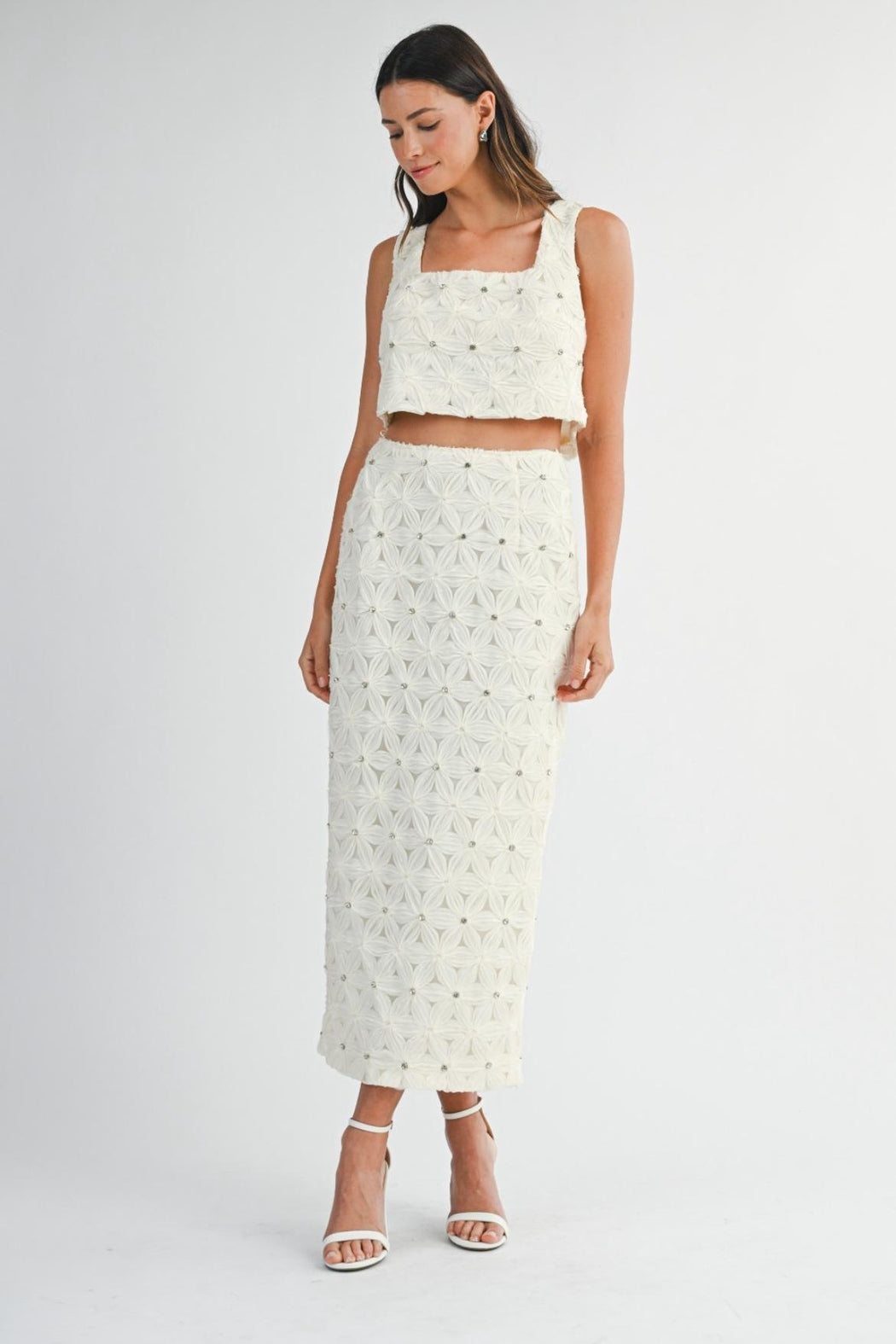 Floral applique square neck crop top and midi skirt set. Model is wearing a size Small
