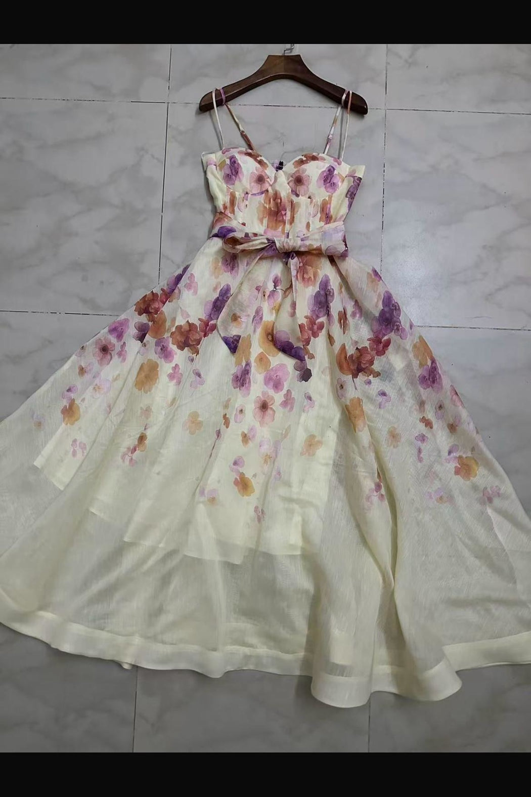 Floral corset midi dress with studded detail, sash belt, and pockets. Size Small is pictured