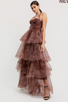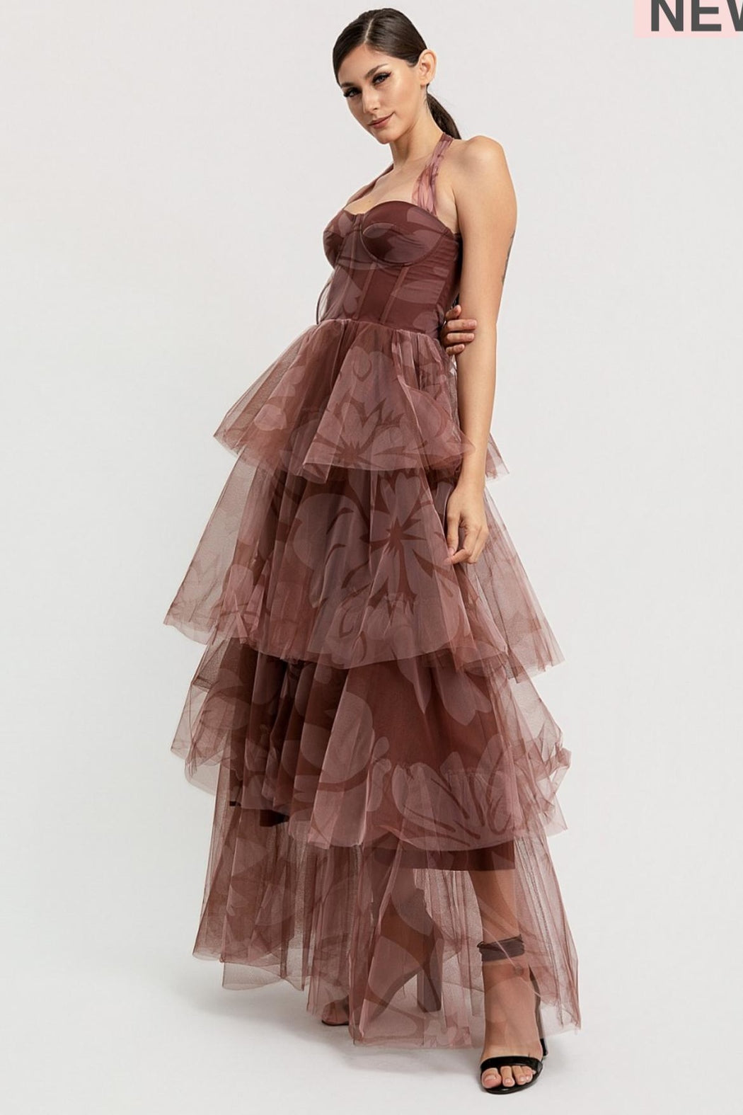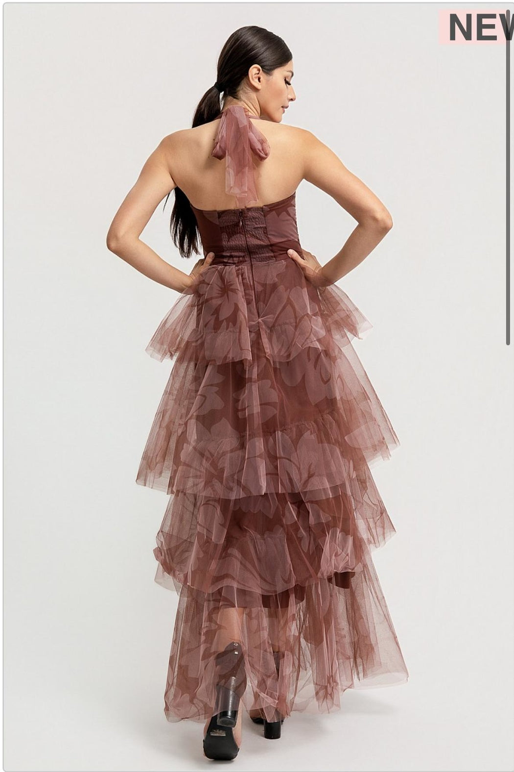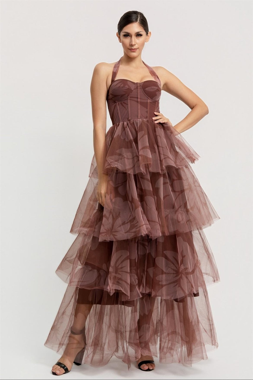 Halter neck tiered floral mesh maxi dress. Model is wearing a size Small