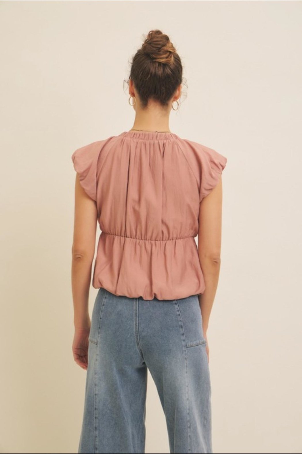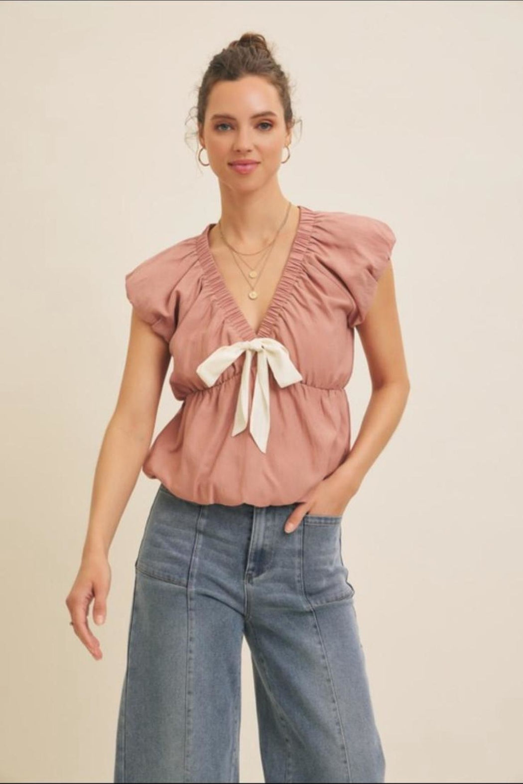 Crinkled front bow bubble top. Model is wearing a size Small